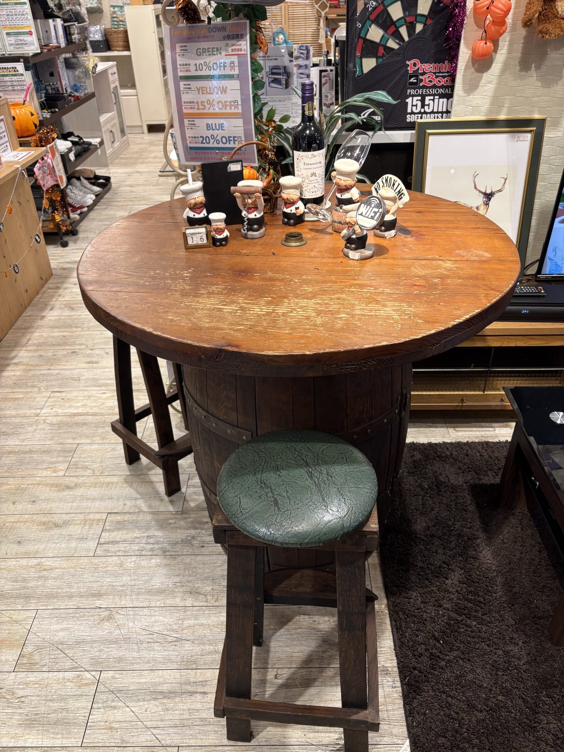 テーブル中央の樽は開閉式の収納スペースになっています。グリーン座面のチェア共々、経年変化を楽しみながら