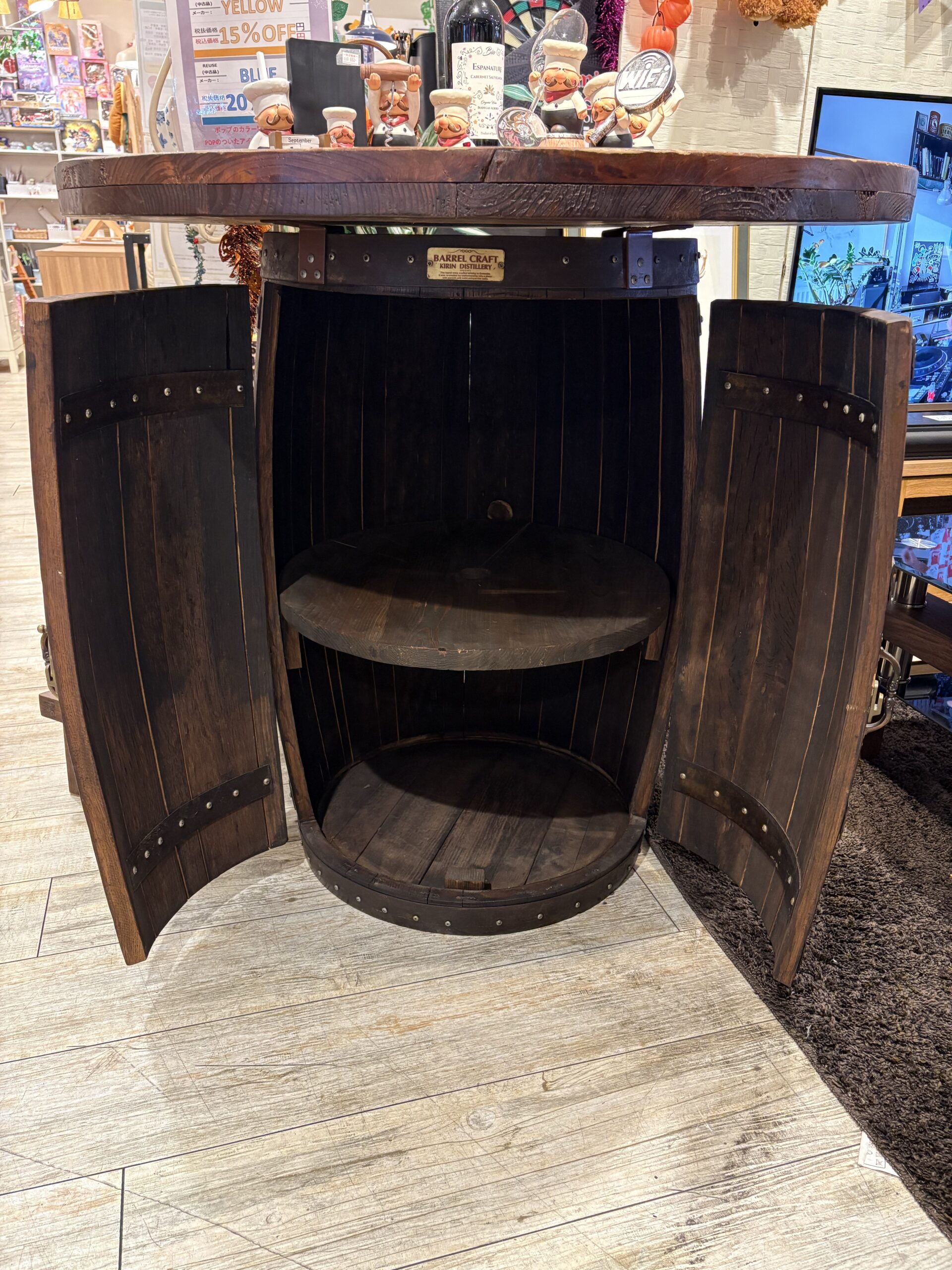 本物のウィスキー樽をリメイクして仕立てた重厚感溢れるカウンターテーブルです。