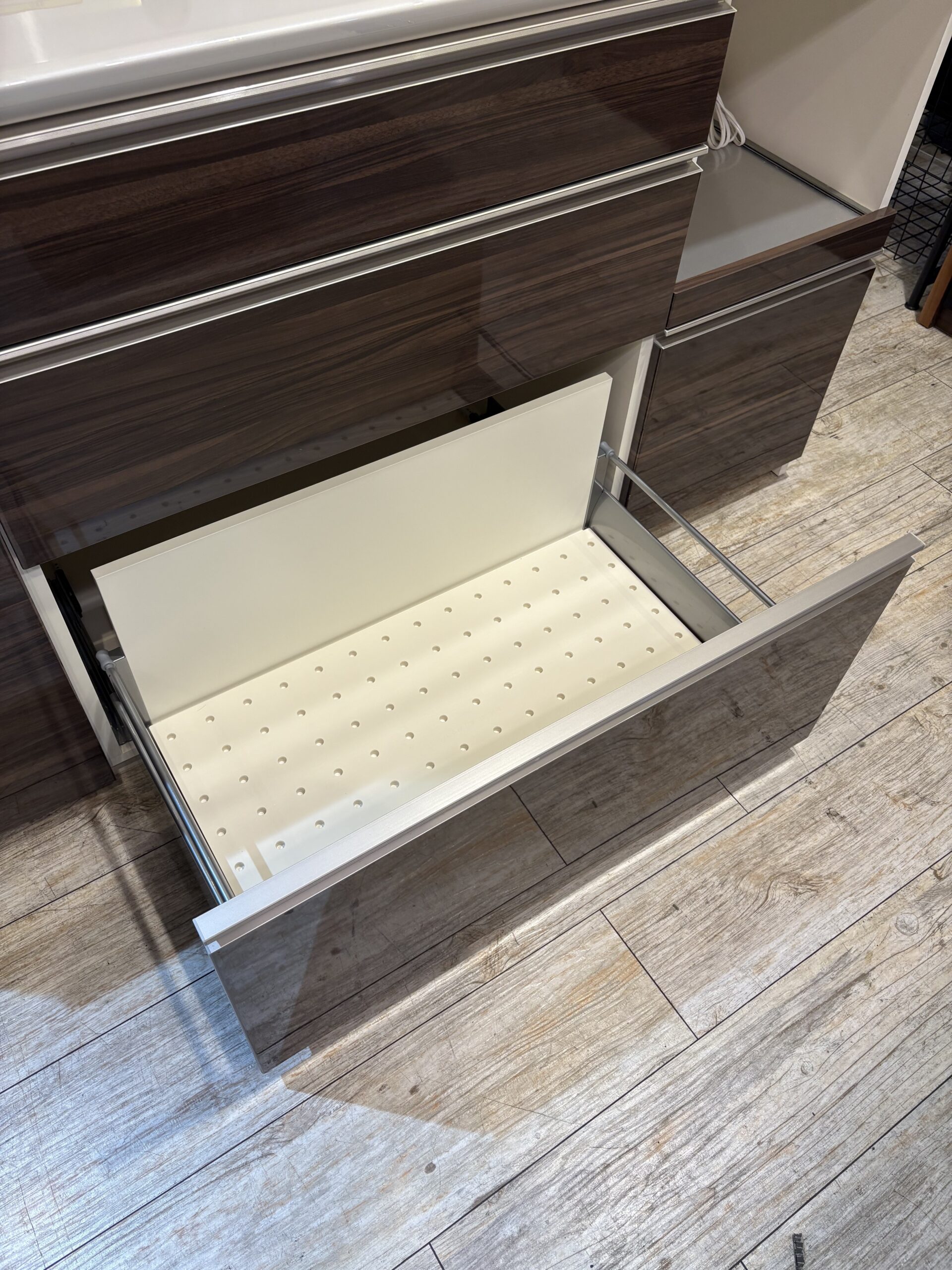木目調の前板と清潔感あふれるホワイト天板が上品なアクセントを与えてくれます。