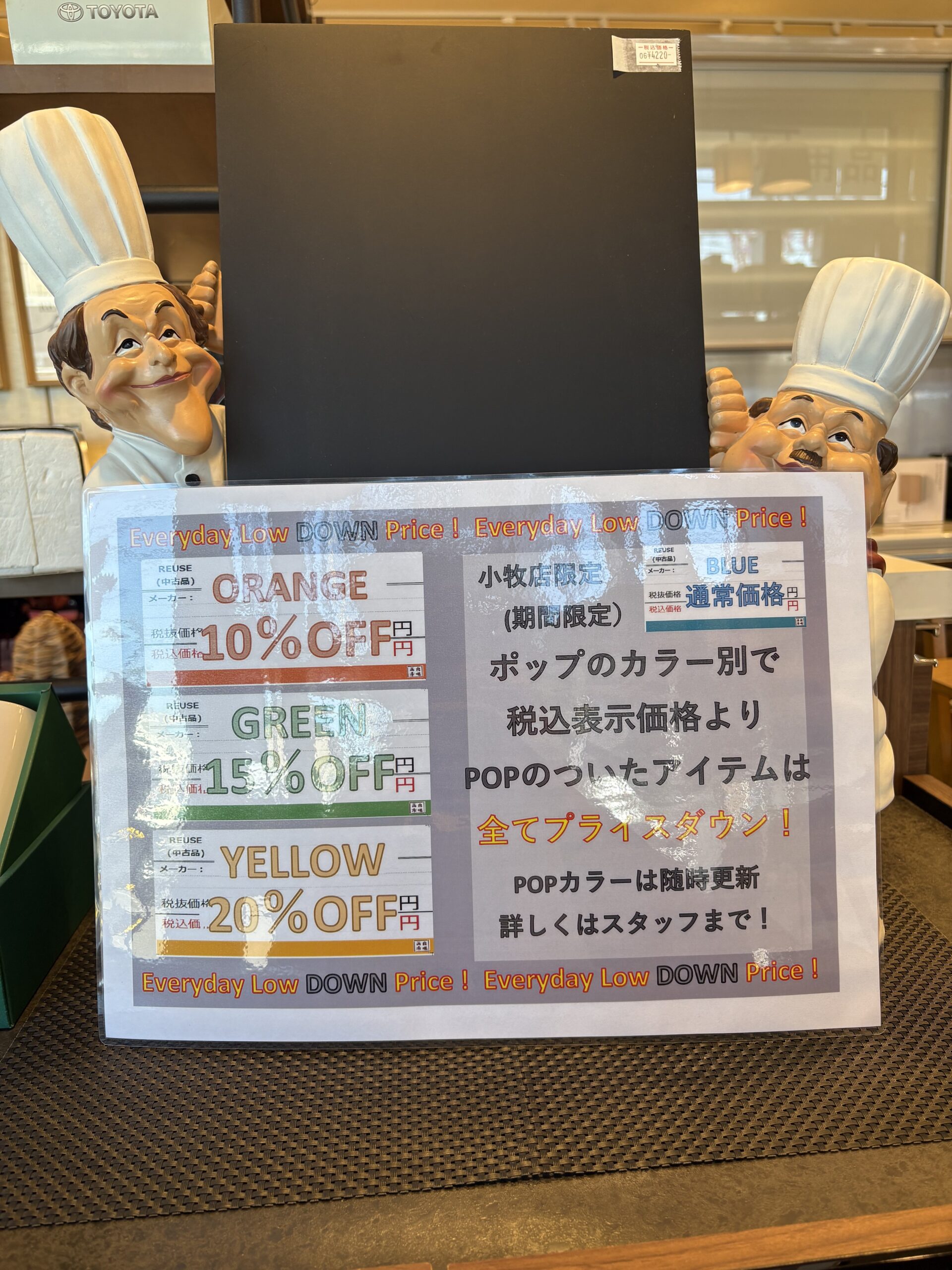 現在再良市場小牧店限定で値札POPの色別でプライスダウンを行っています。