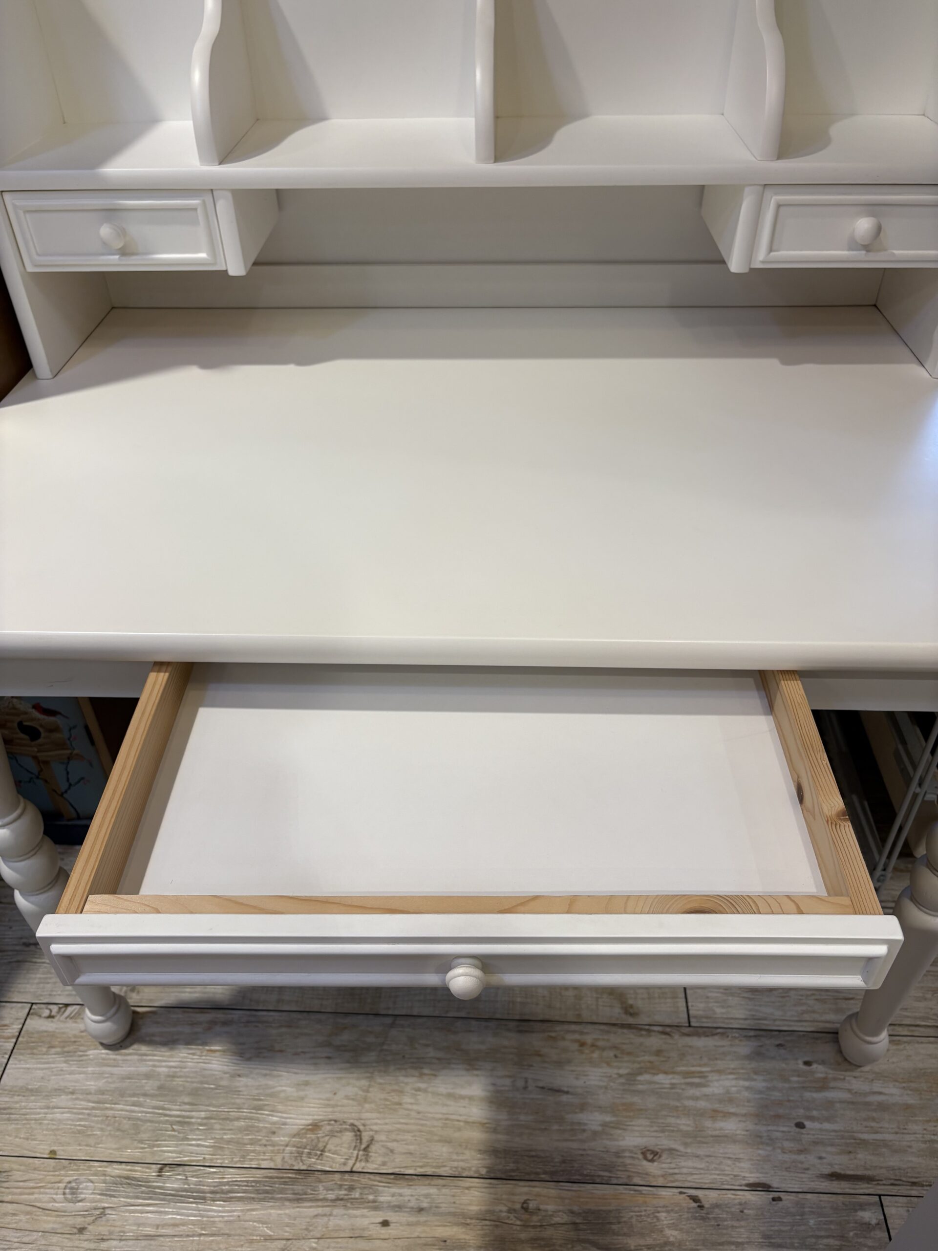 やさしいホワイトカラーと、曲線をいかしたクラシックなデザインが魅力のデスクセットです。