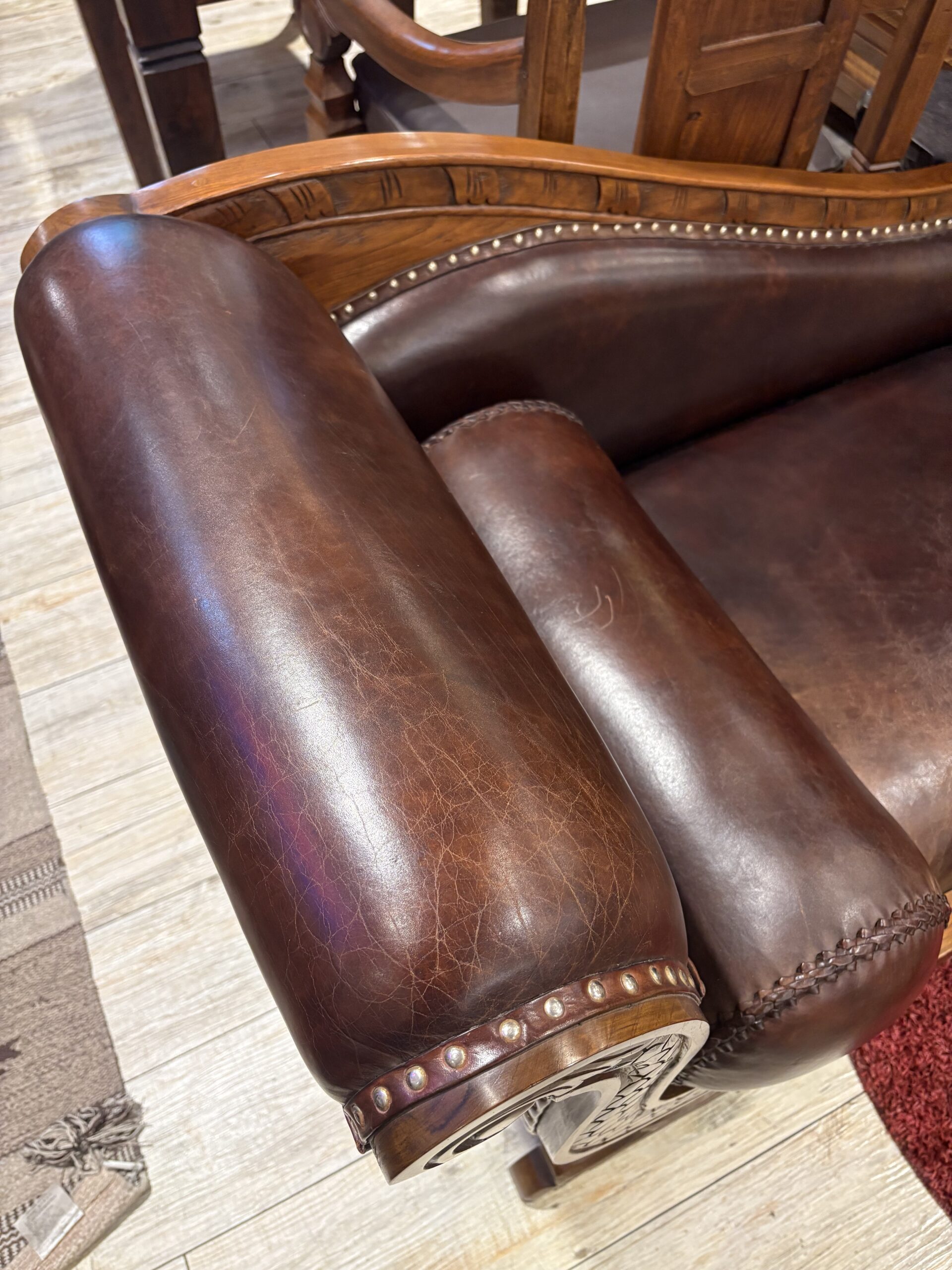 重厚な無垢材フレームと、深みのあるブラウンレザーが目を惹くクラシカルなカウチソファです。