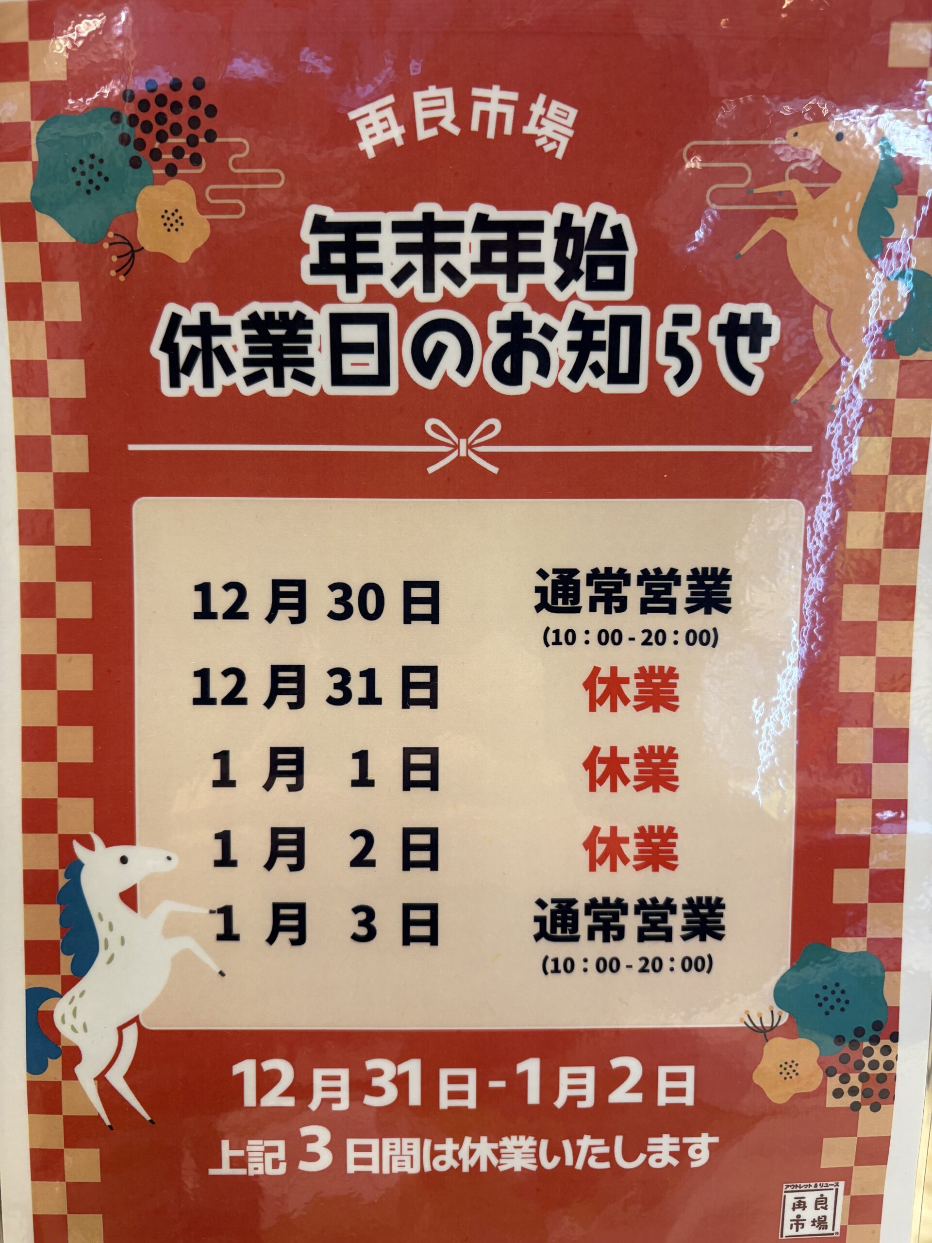 また再良市場全店、年末年始の12月31日から1月1日、1月2日の3日間は休業いたします。