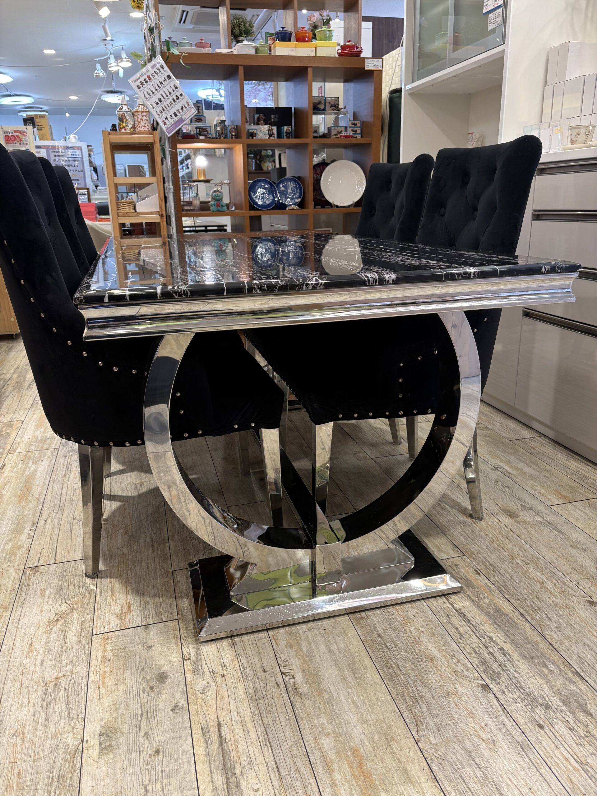 艶やかなブラックの大理石天板と、重厚感溢れるクローム脚が目を惹くダイニングセットです。