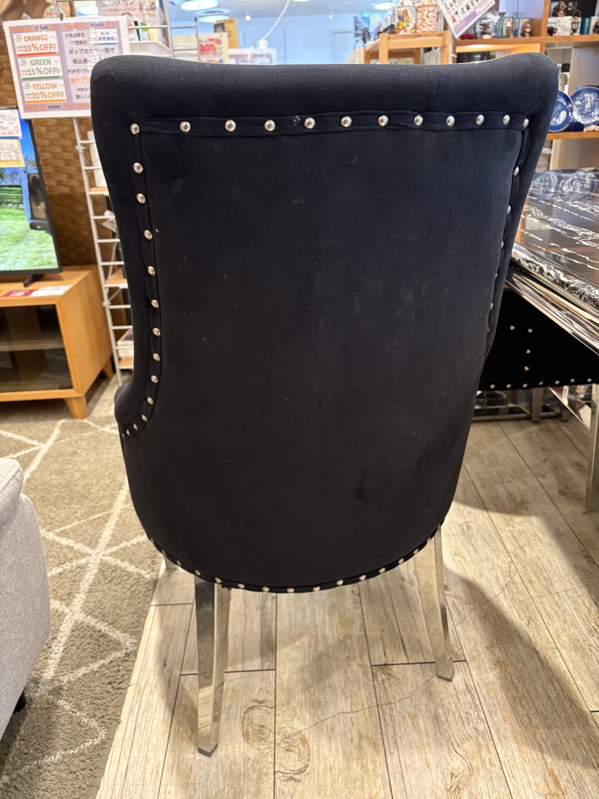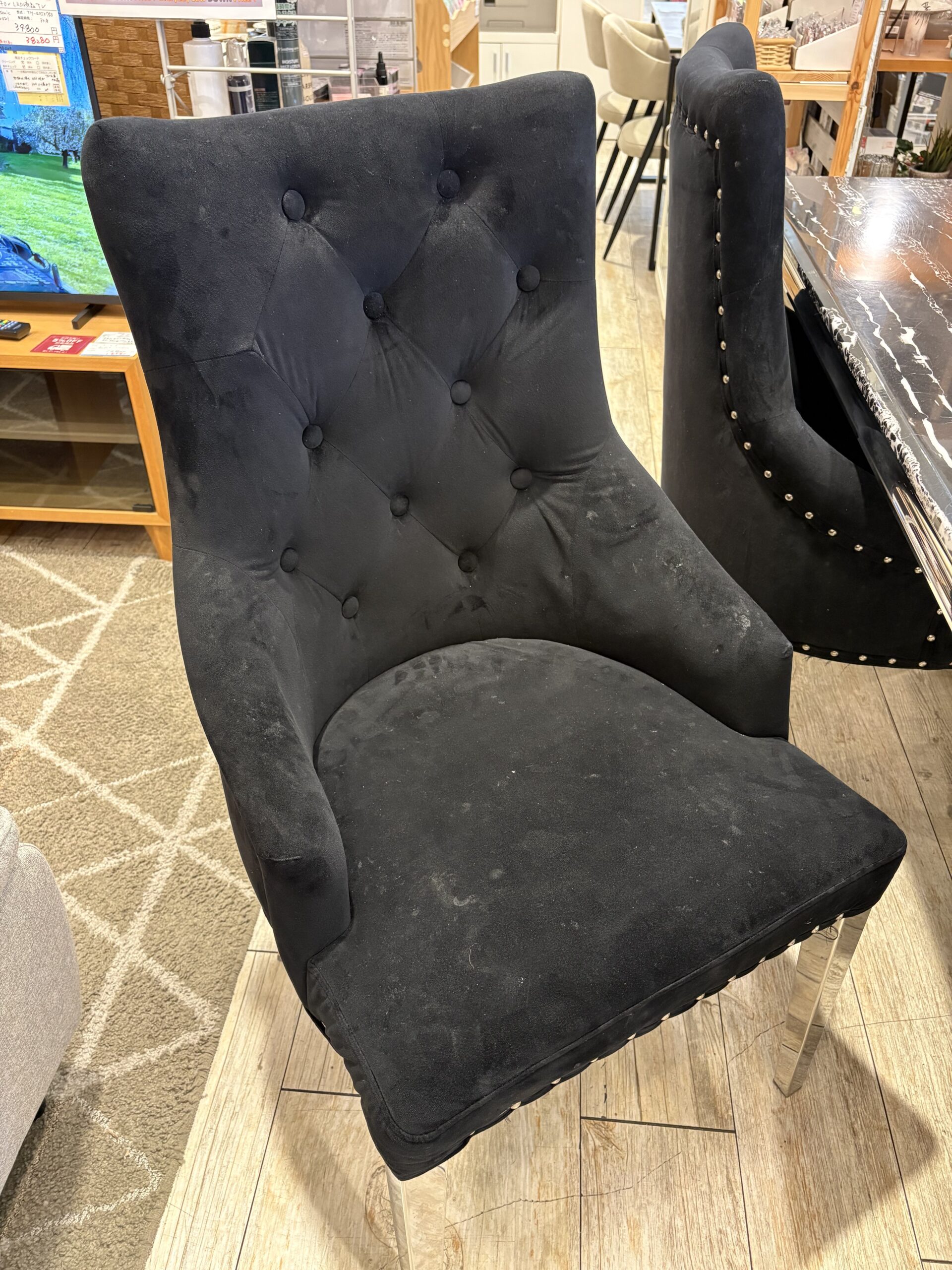 チェアはブラックファブリックに鋲打ちデザインを施したクラシカルな佇まいです。
