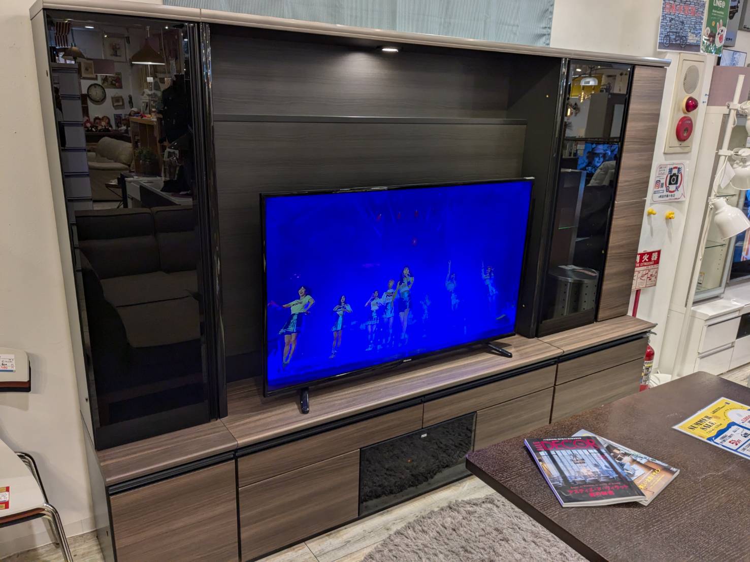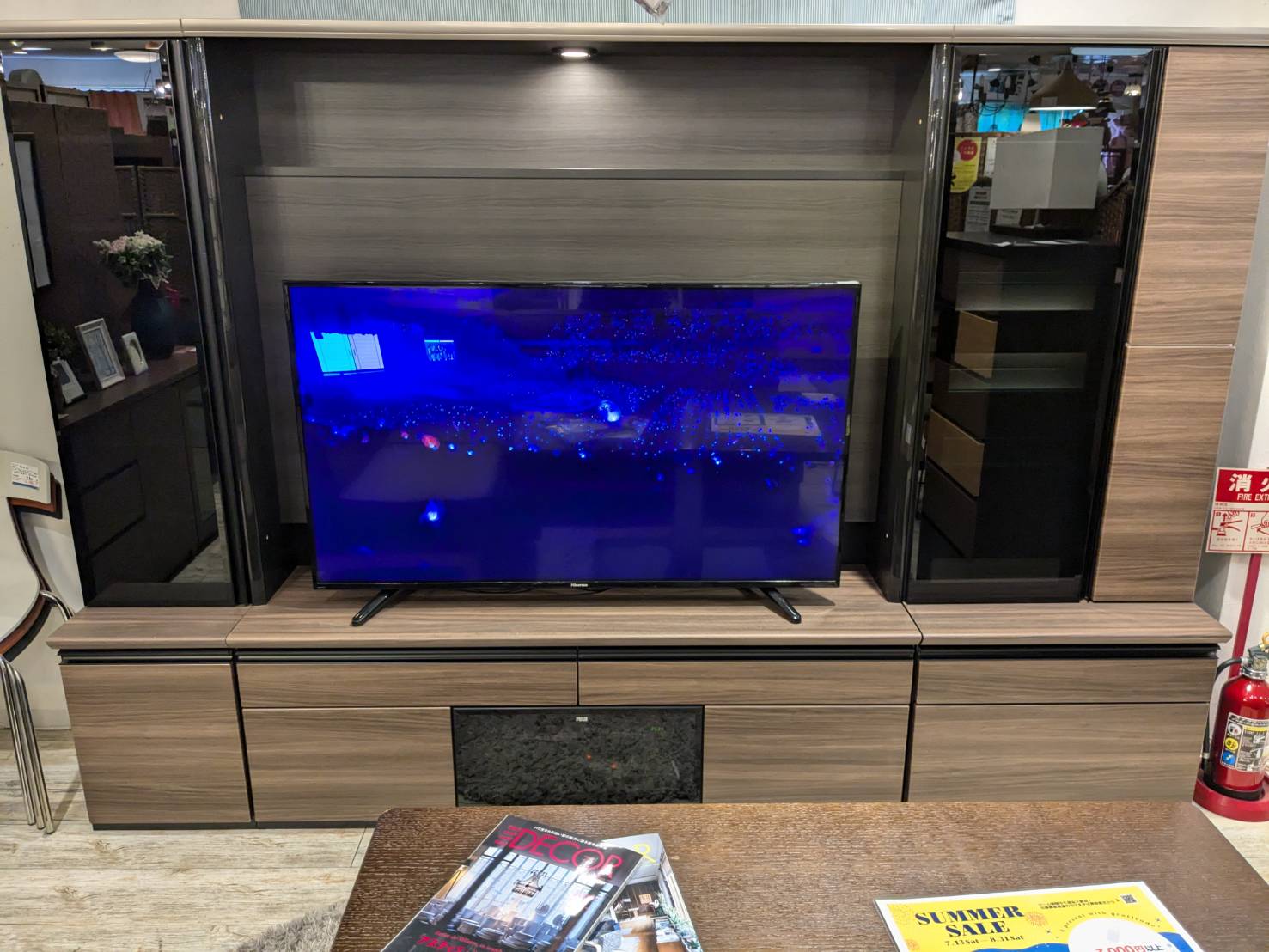 左右収納は大容量でAV機器もコンパクトに収納可能です。右側はライトアップもできますよー!