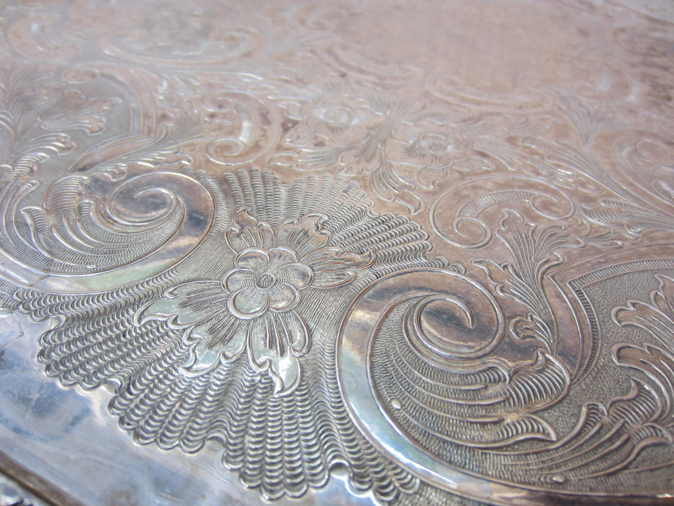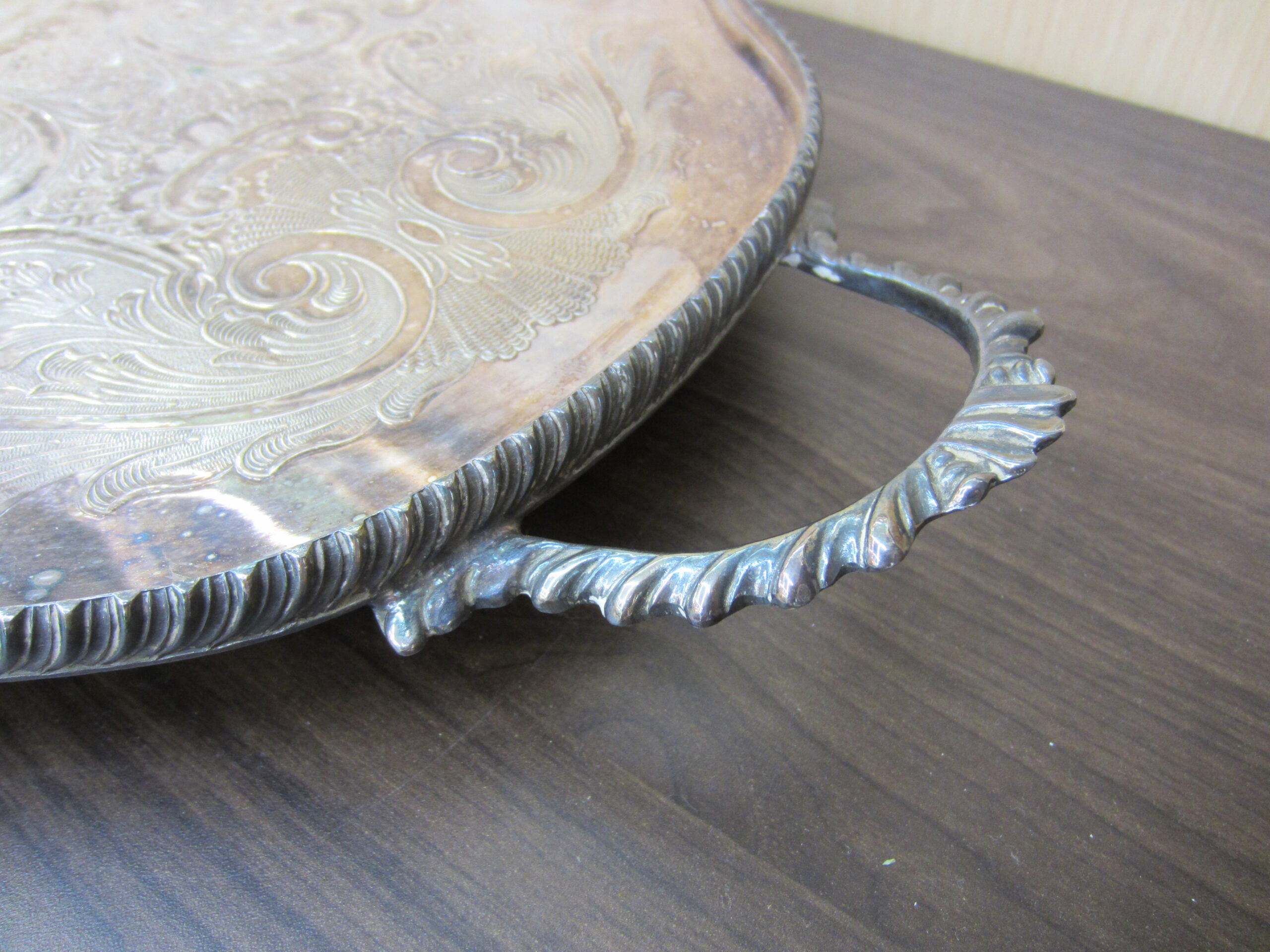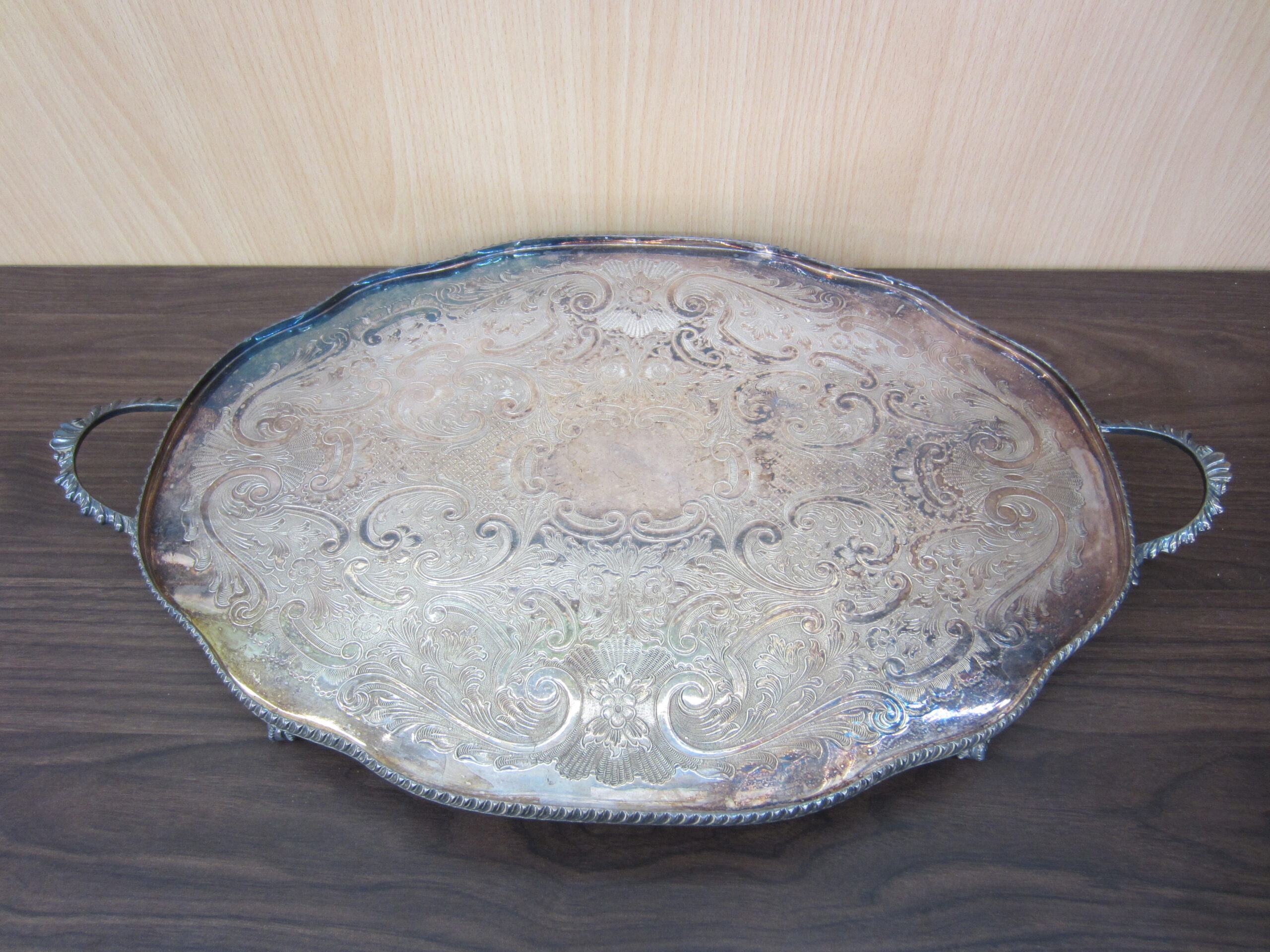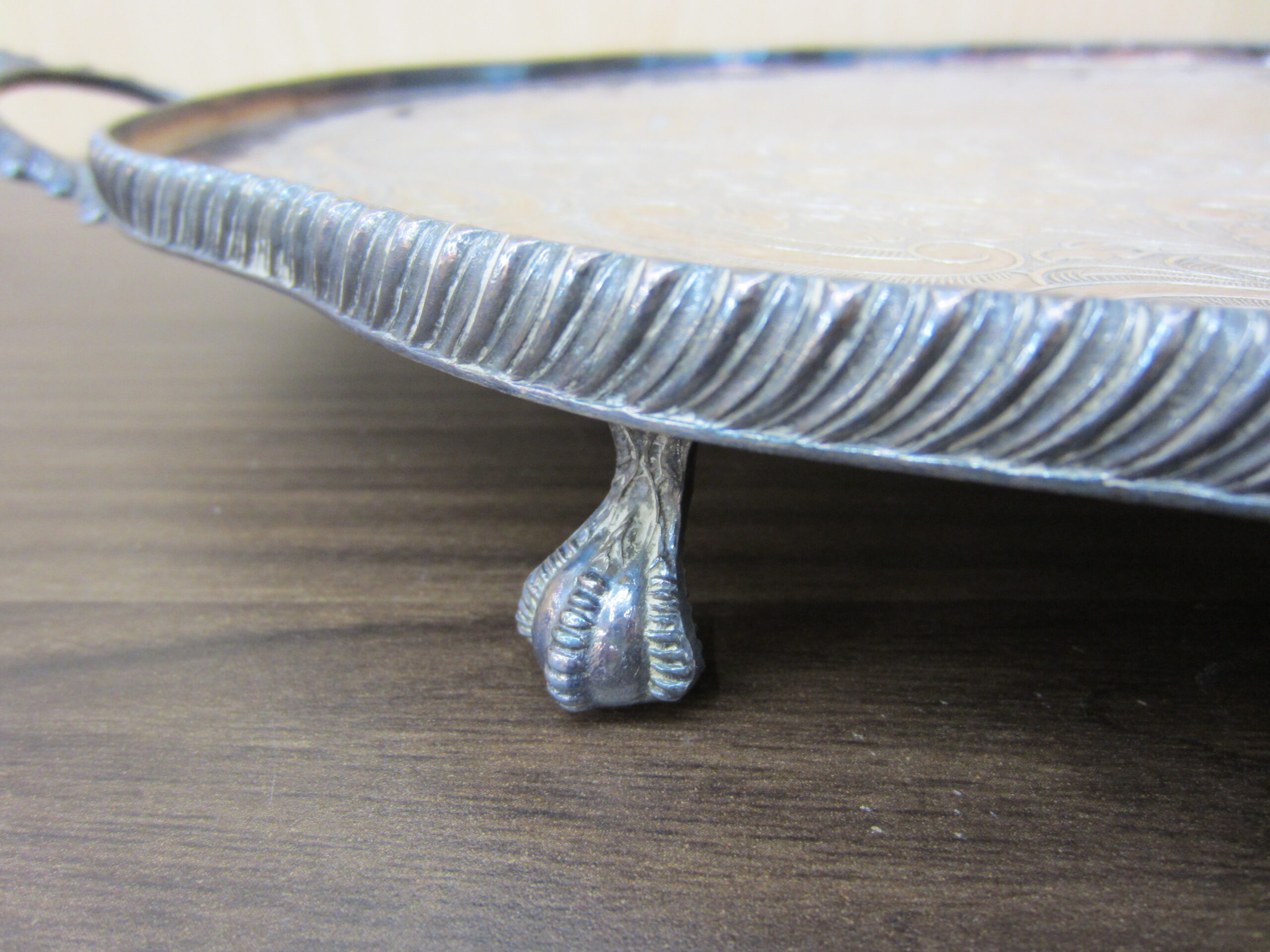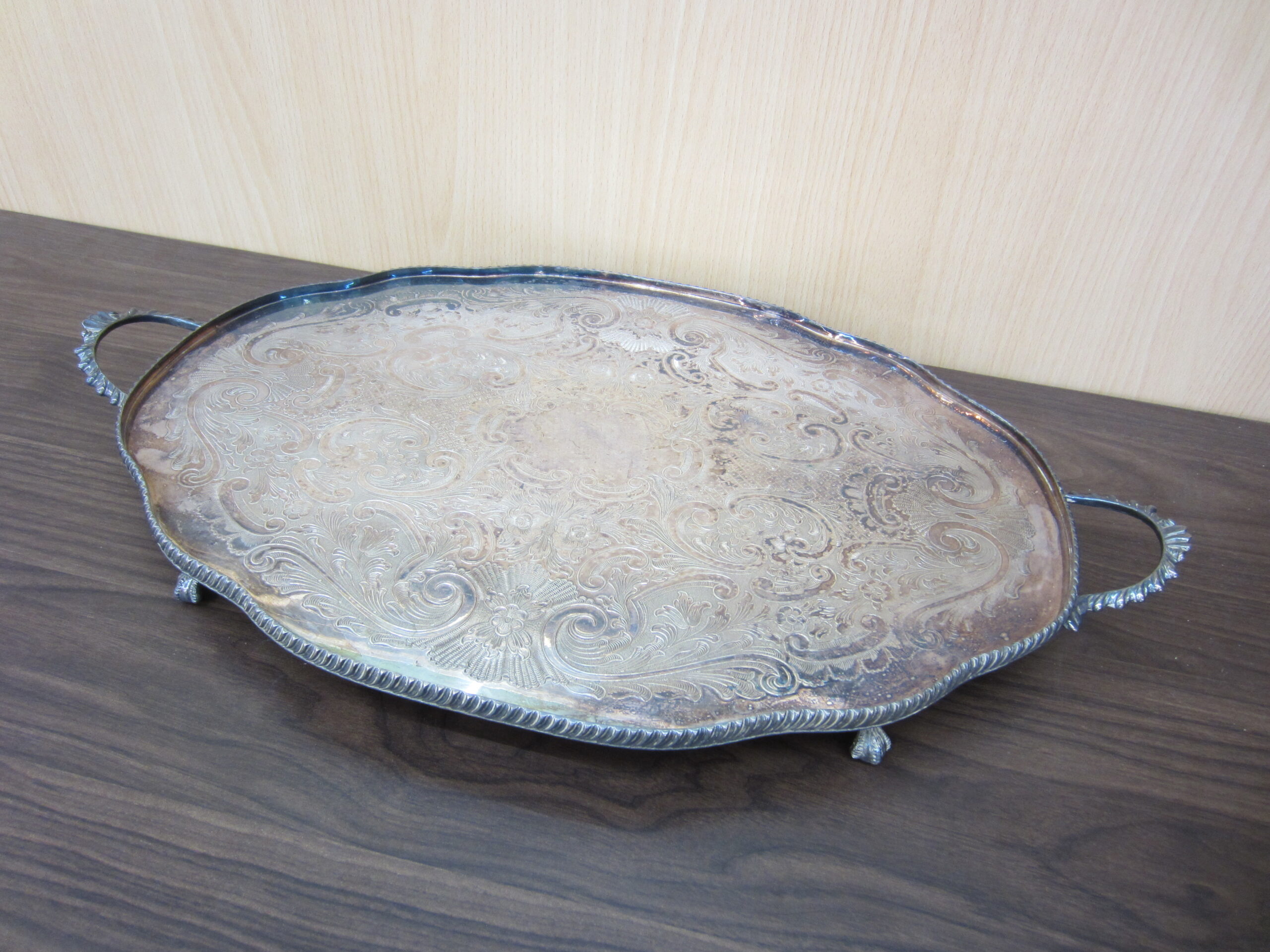 イギリス製の脚付き シルバー オーバルトレイです。