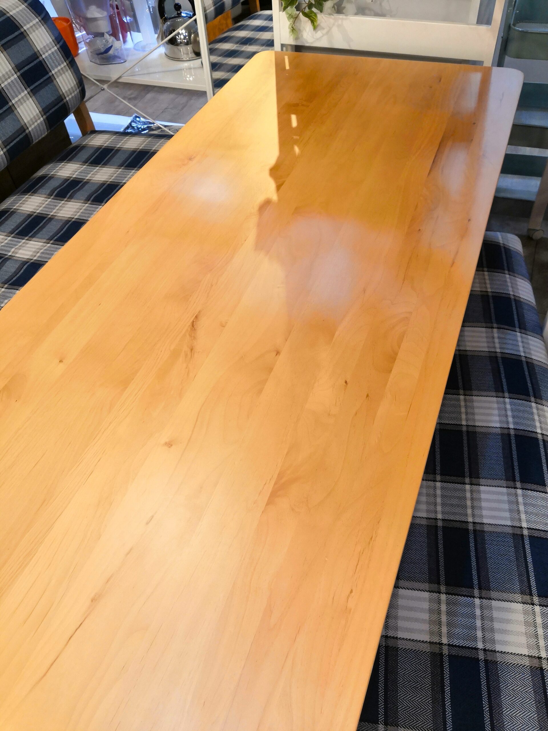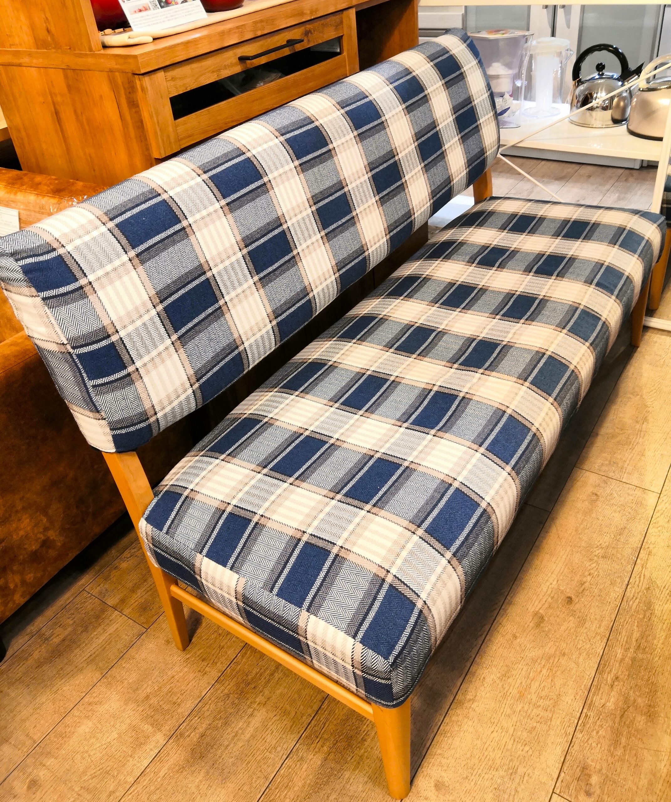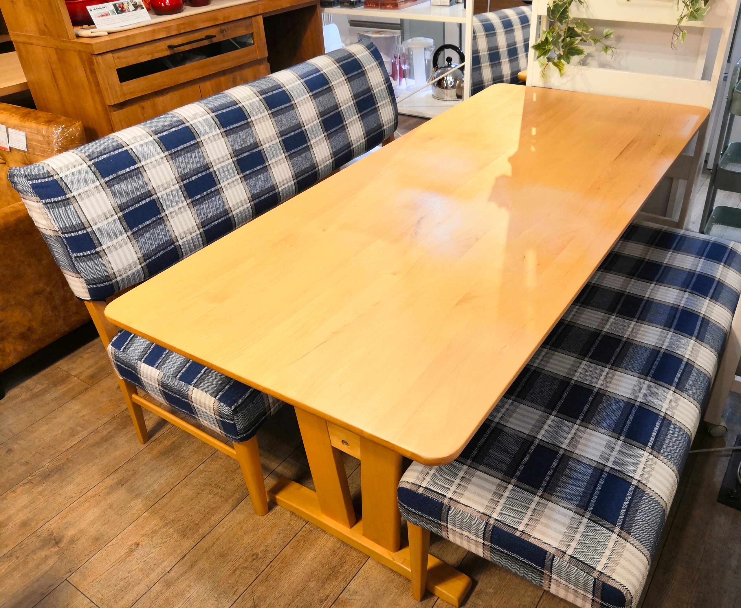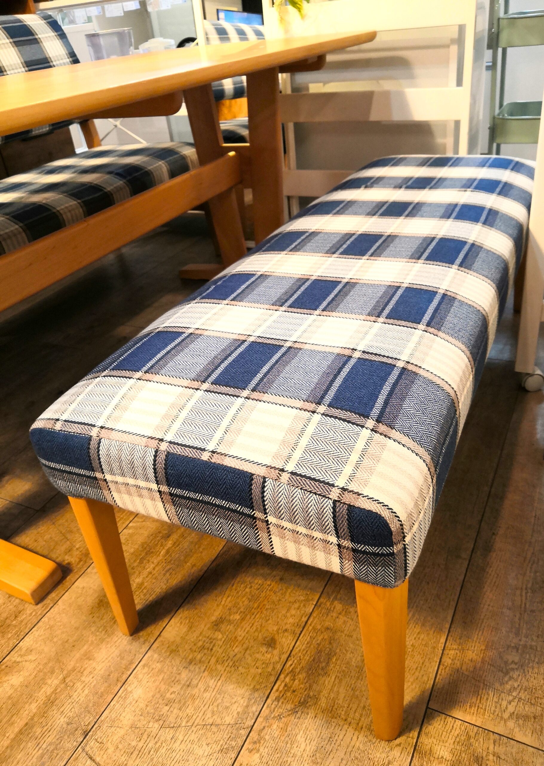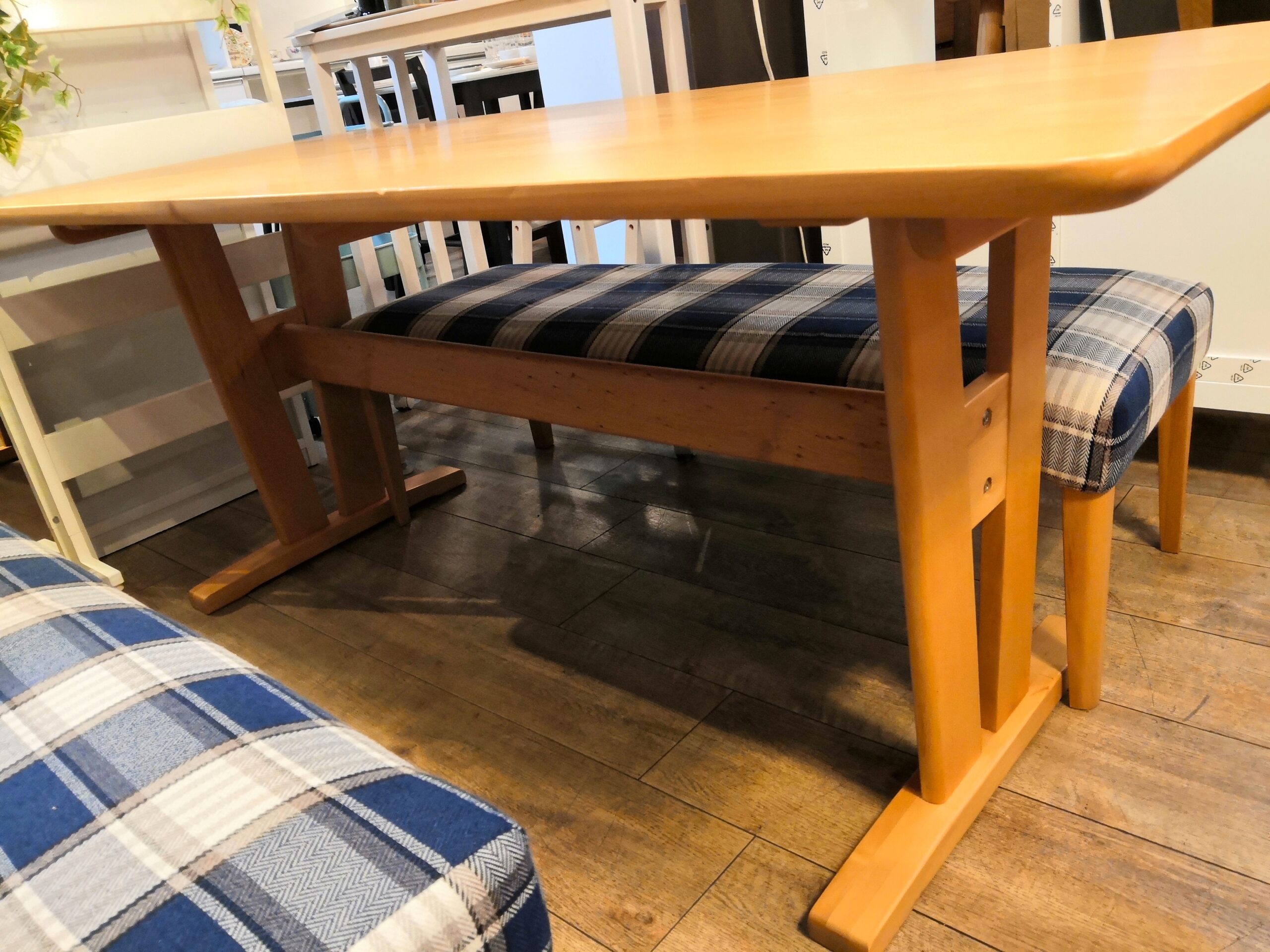 【中古品】 北欧インテリア チェック柄 ブルー系 天然木 カバーリング仕様 ベンチ ダイニング3点セット 買取しました。25年10月14日