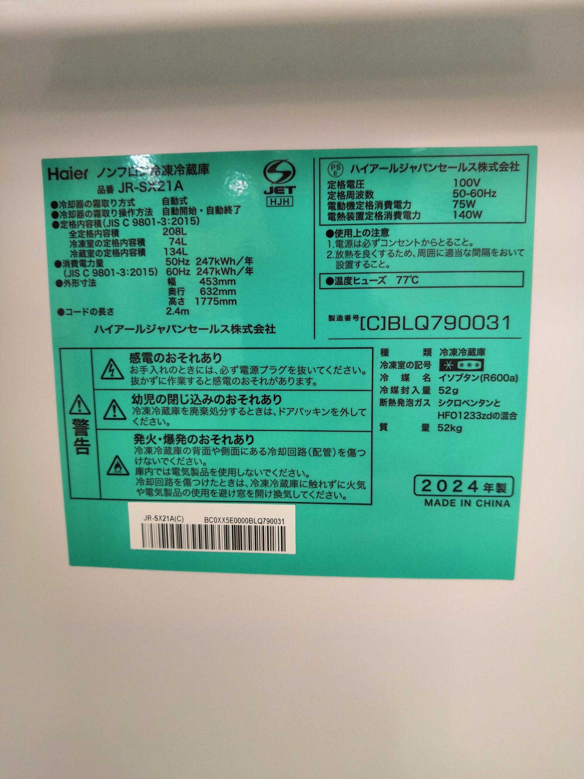 【極美品】Haier ハイアール 2024年製 Freemo 省スペース スリム ファン式 ナチュラルベージュ 208L 2ドア ノンフロン 冷蔵庫 買取しました。25年11月7日
