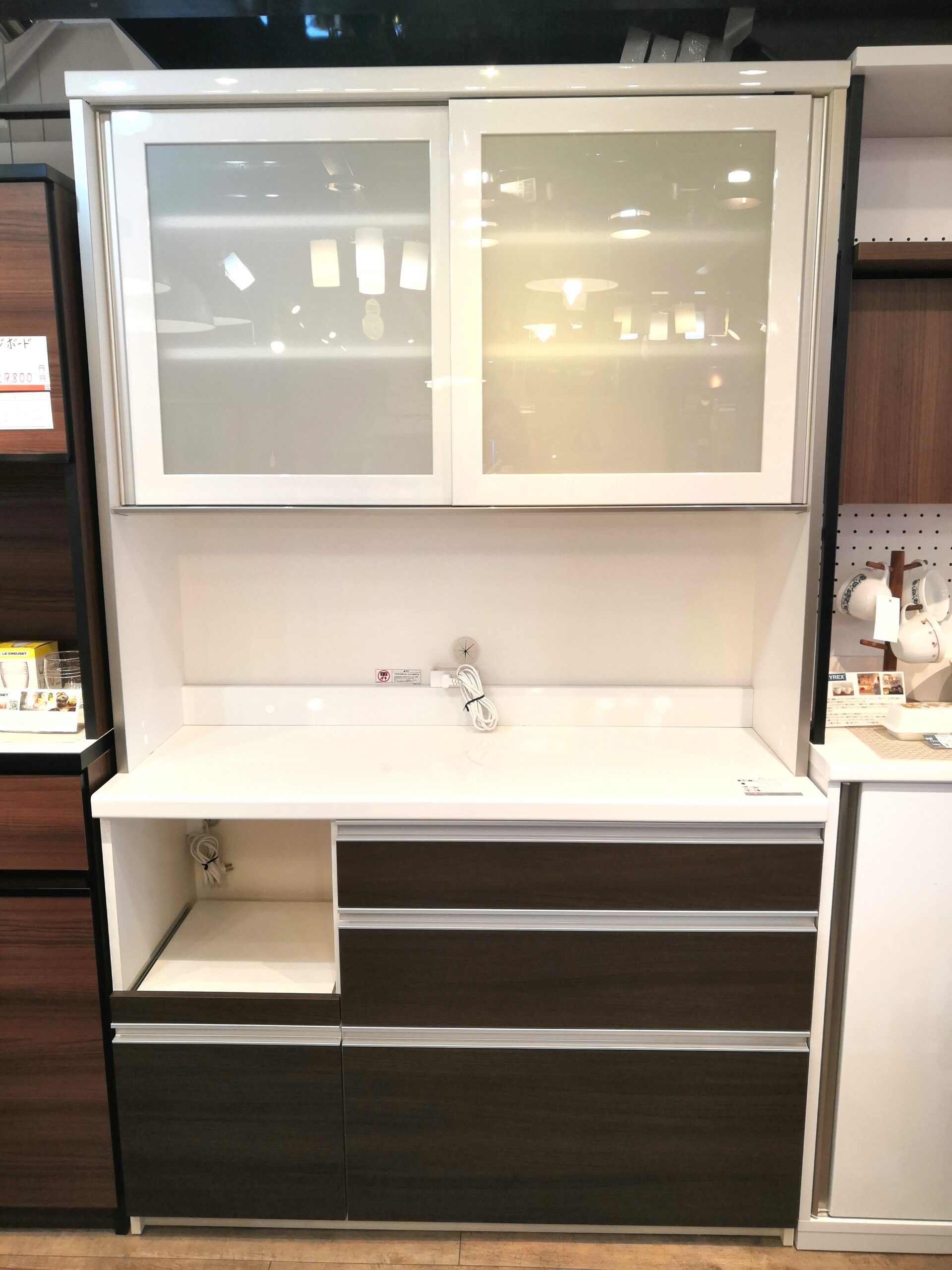 キッチン家具 収納家具 ソフトクローズ機能 ブラウン×ホワイト 鏡面仕上げ 木目調 キッチンボード