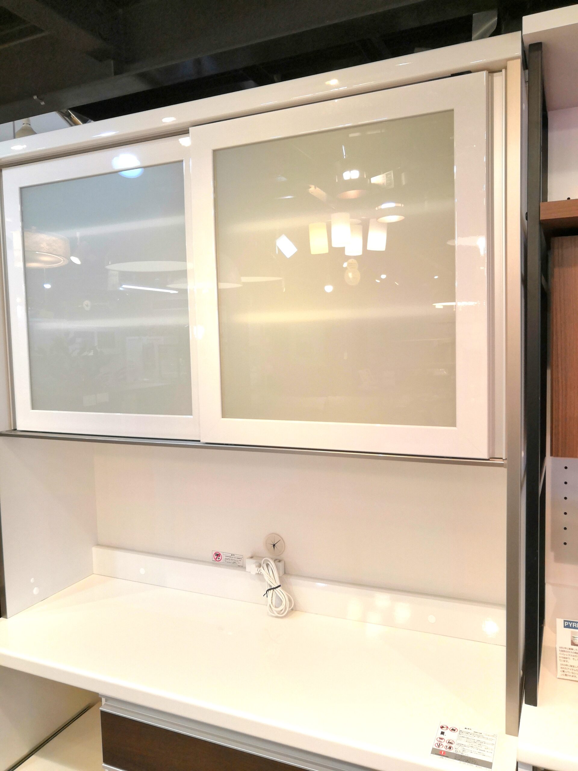 ◎家電収納スペースは、ホワイトの鏡面仕上げ。