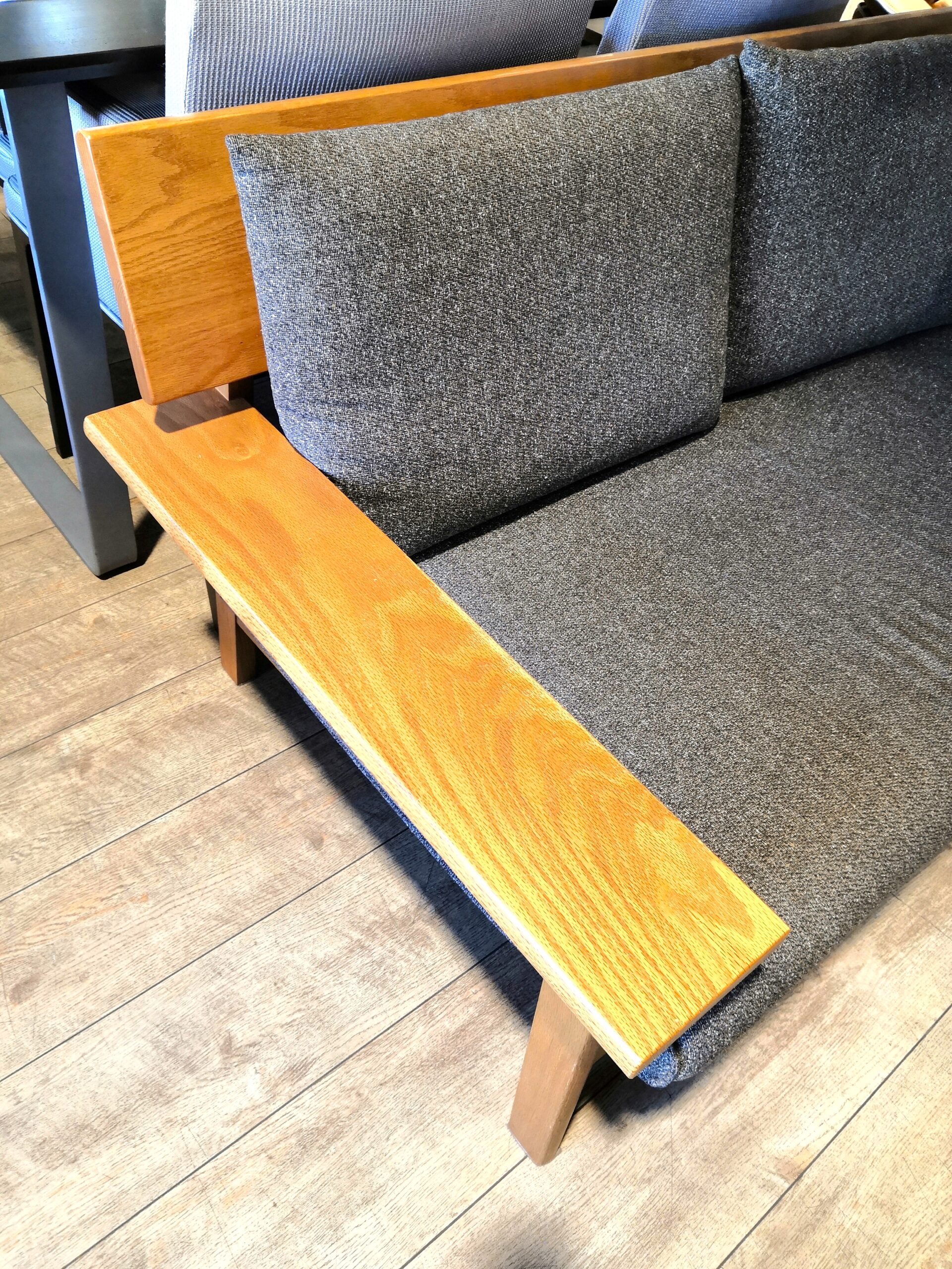 ◎アーム付きの木製フレームの2シーターソファ、ALMO。