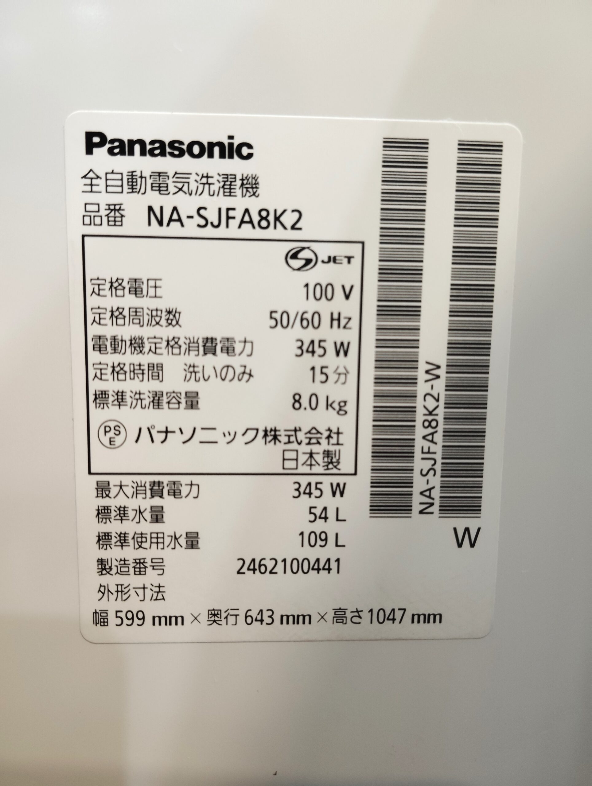【中古品】Panasonic 2024年製 NA-SJFA8K2 マットホワイト 自動投入 縦型 インバーター搭載 8Kg 全自動洗濯機 買取しました。25年11月28日