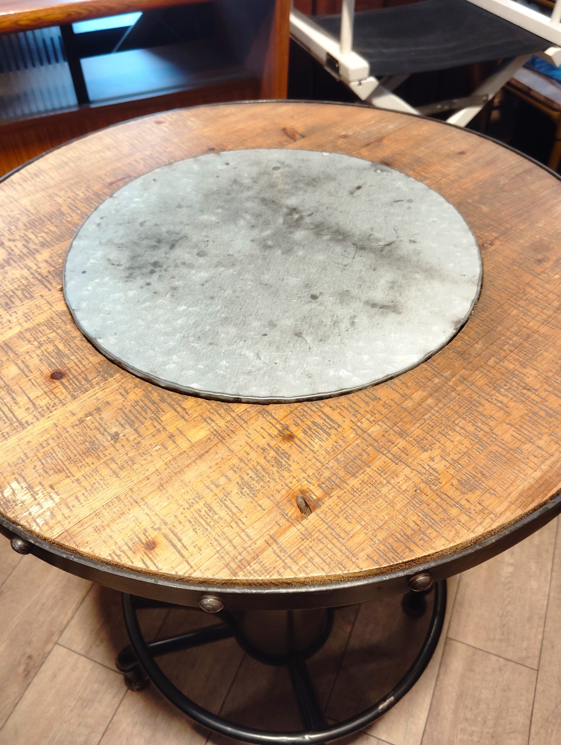 ◎古木の天板に、ダメージ加工のされた鉄板がはめ込んである、カフェテーブル。