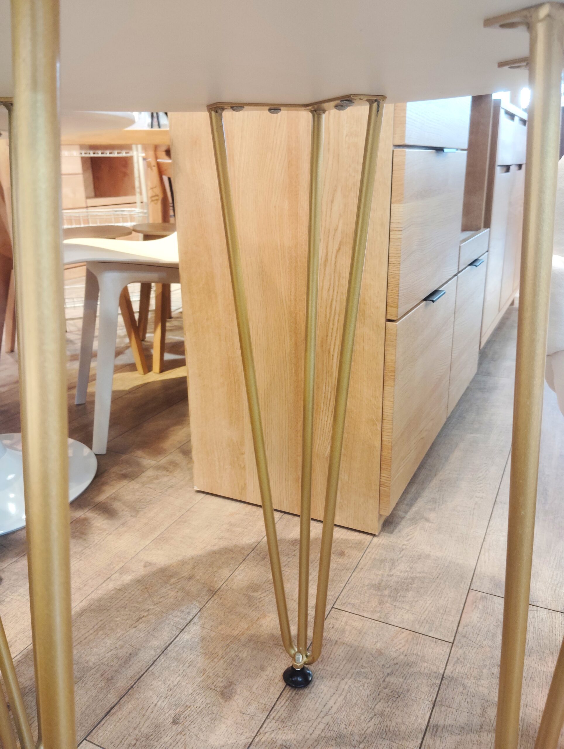 鏡面仕上げの美しいテーブルです。ゴールドの脚は、3本が1本になったデザインでしっかり天板を支えます。