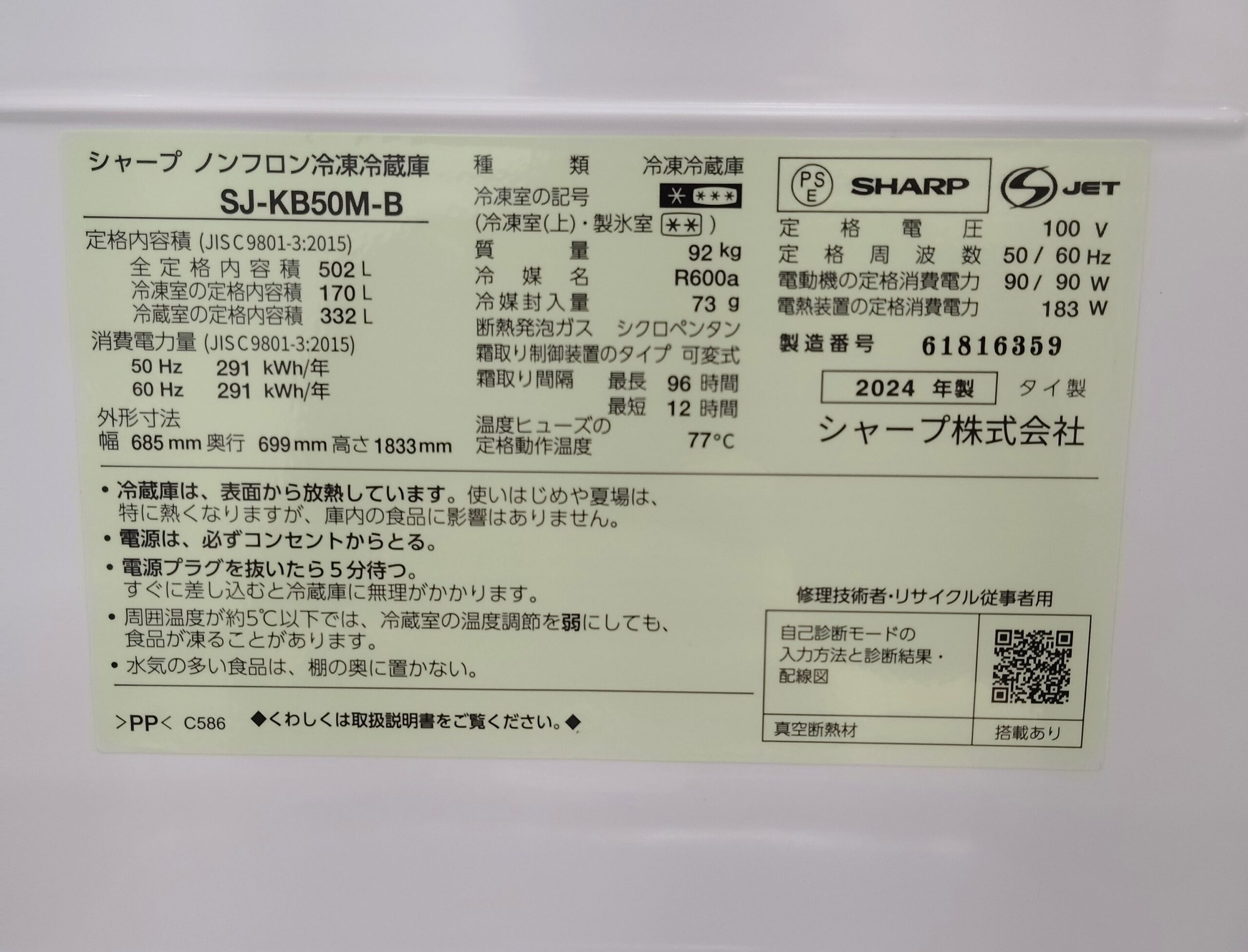 【中古品】SHARP 2024年製 観音開き 循環プラズマクラスター メガ冷凍室 キラット製氷 SJ-KB50M-B 6ドア 502L 冷蔵庫 買取しました。26年1月8日