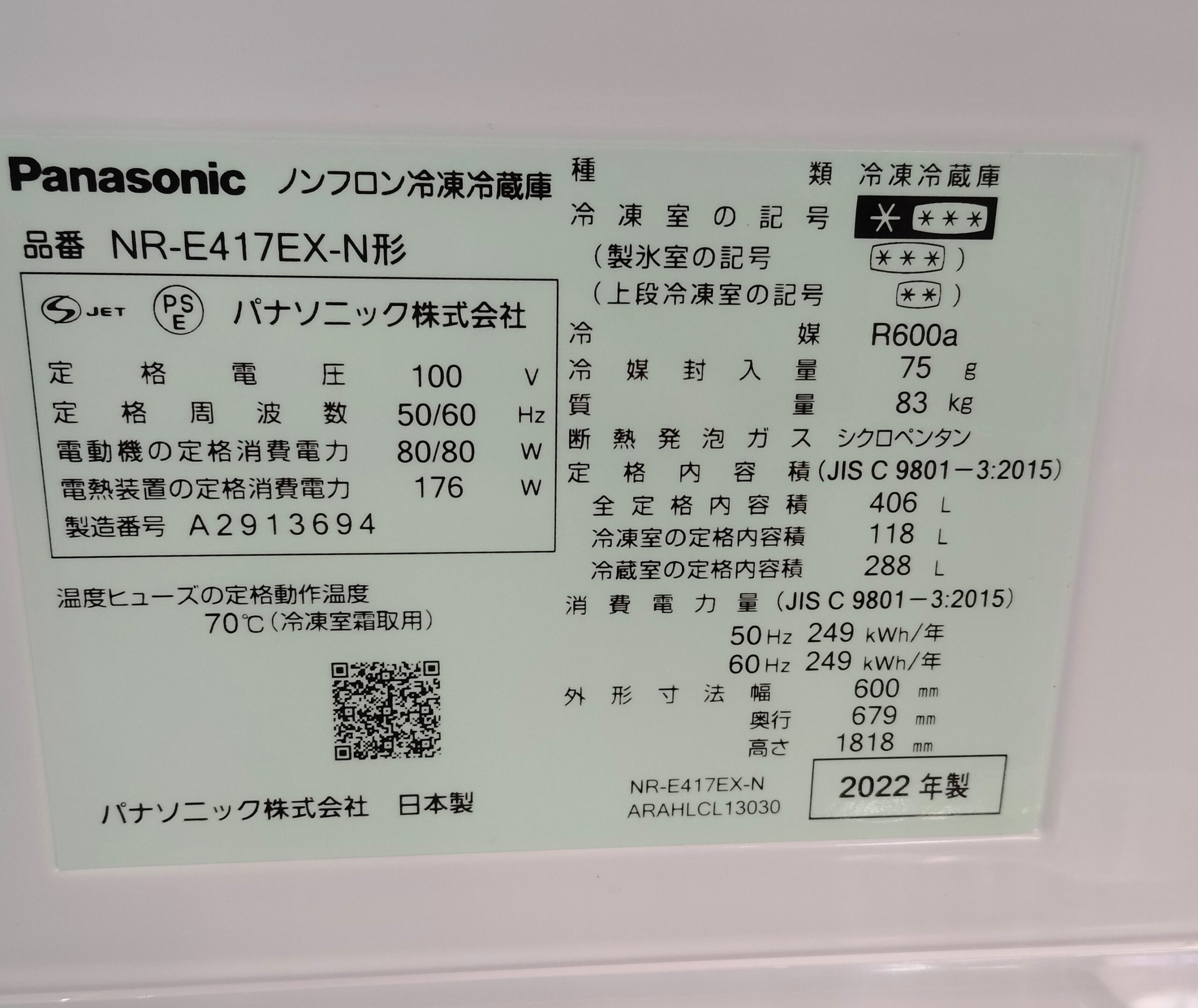 【中古品】Panasonic 2022年製 エコナビ NR-E417EX-N グレインベージュ 右開き 5ドア 406L 冷蔵庫 買取しました。26年1月15日