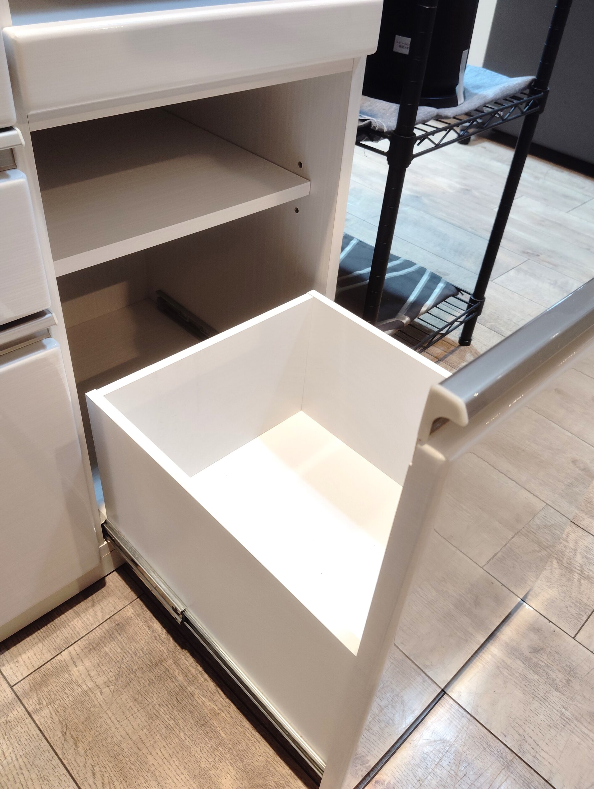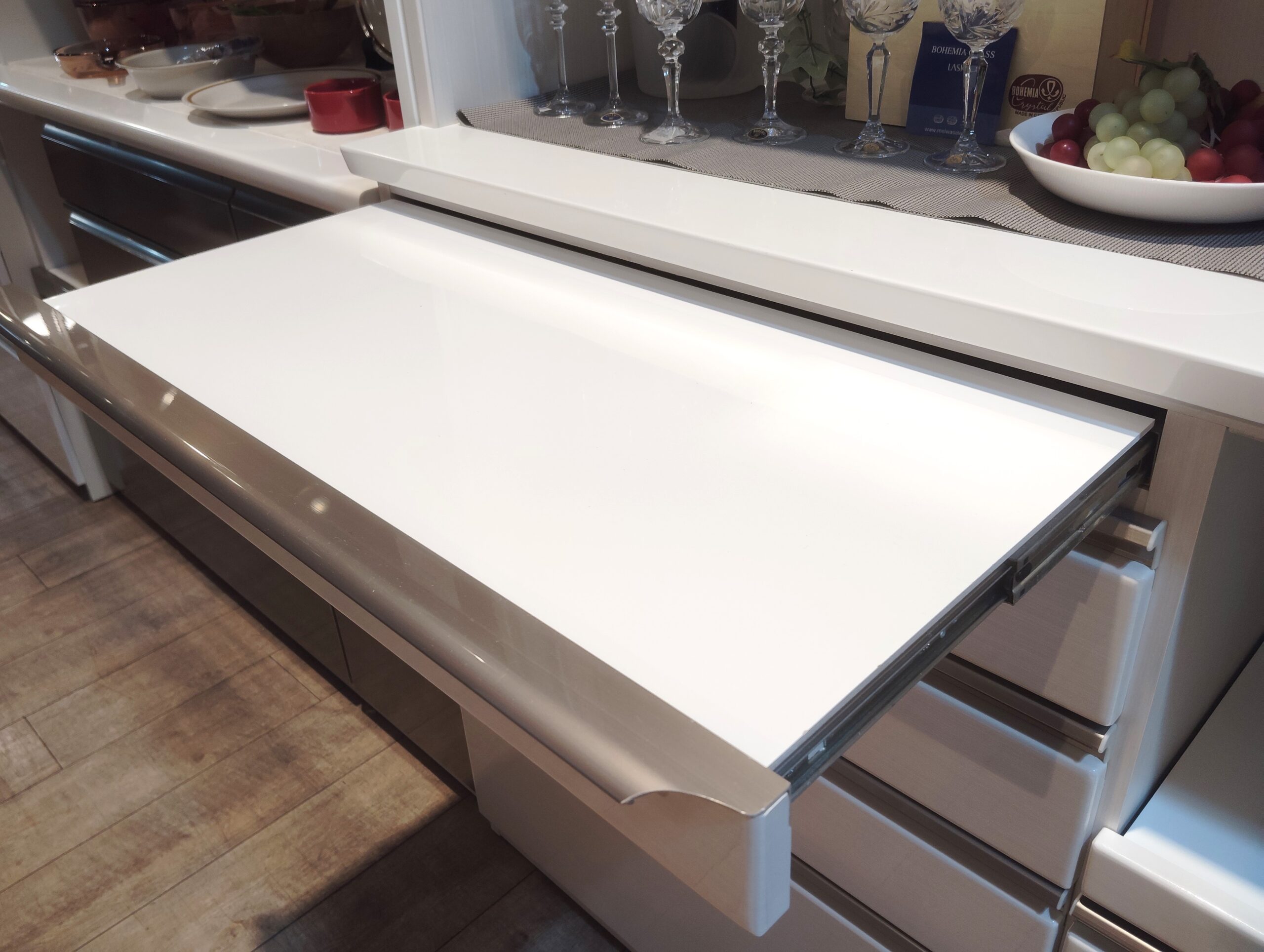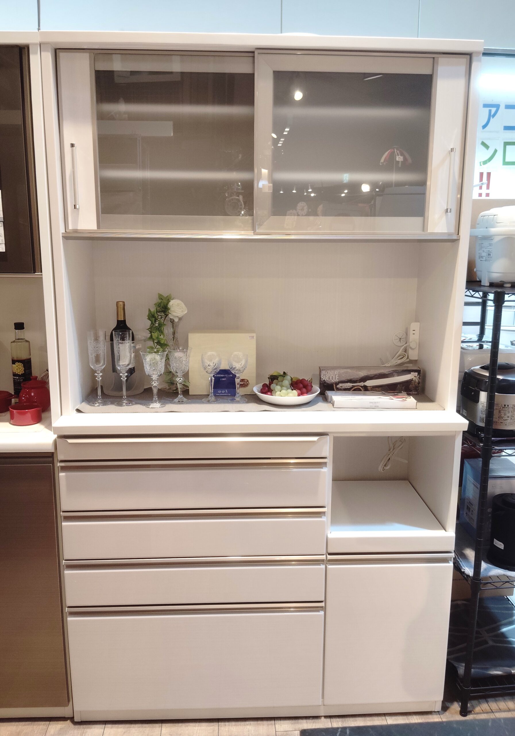 収納家具 家電収納 食器棚 スライド作業台 木目調 白 鏡面仕上げ ハイグロス仕上げ キッチンボード カップボード