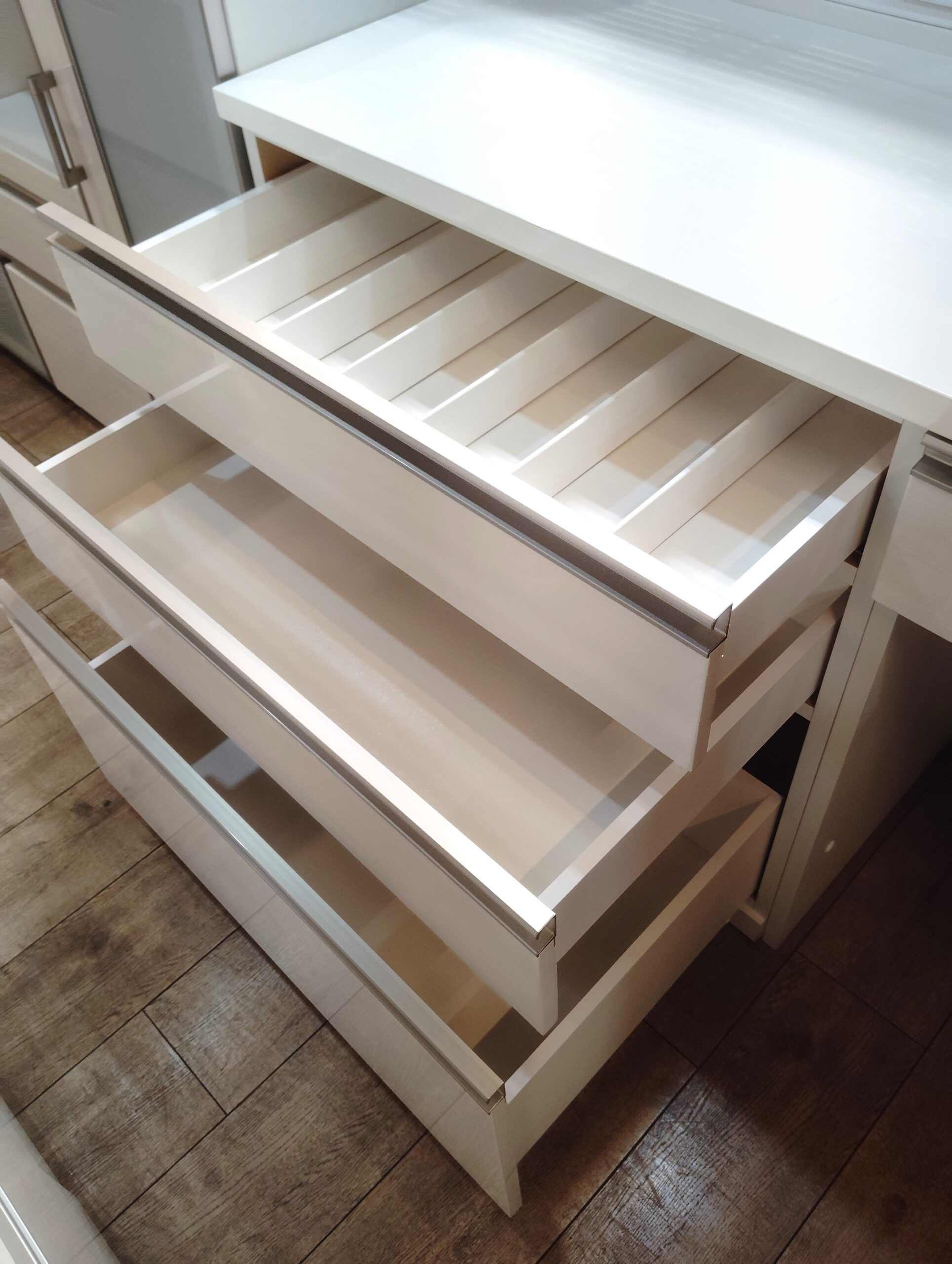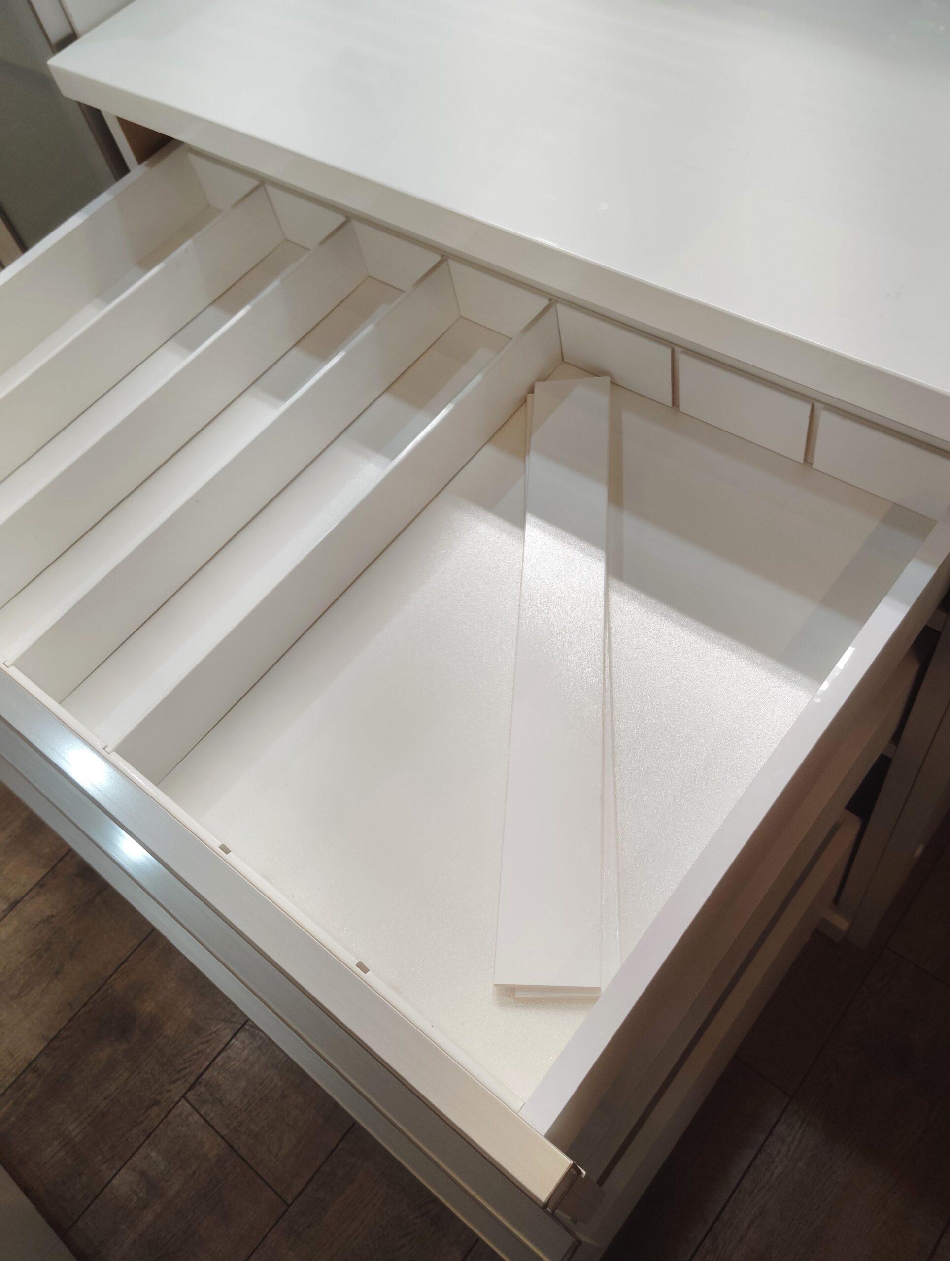 便利なダストボックススペース付き、引き出し内に仕切り付き、引き出し全段ソフトクローズ機能付き。