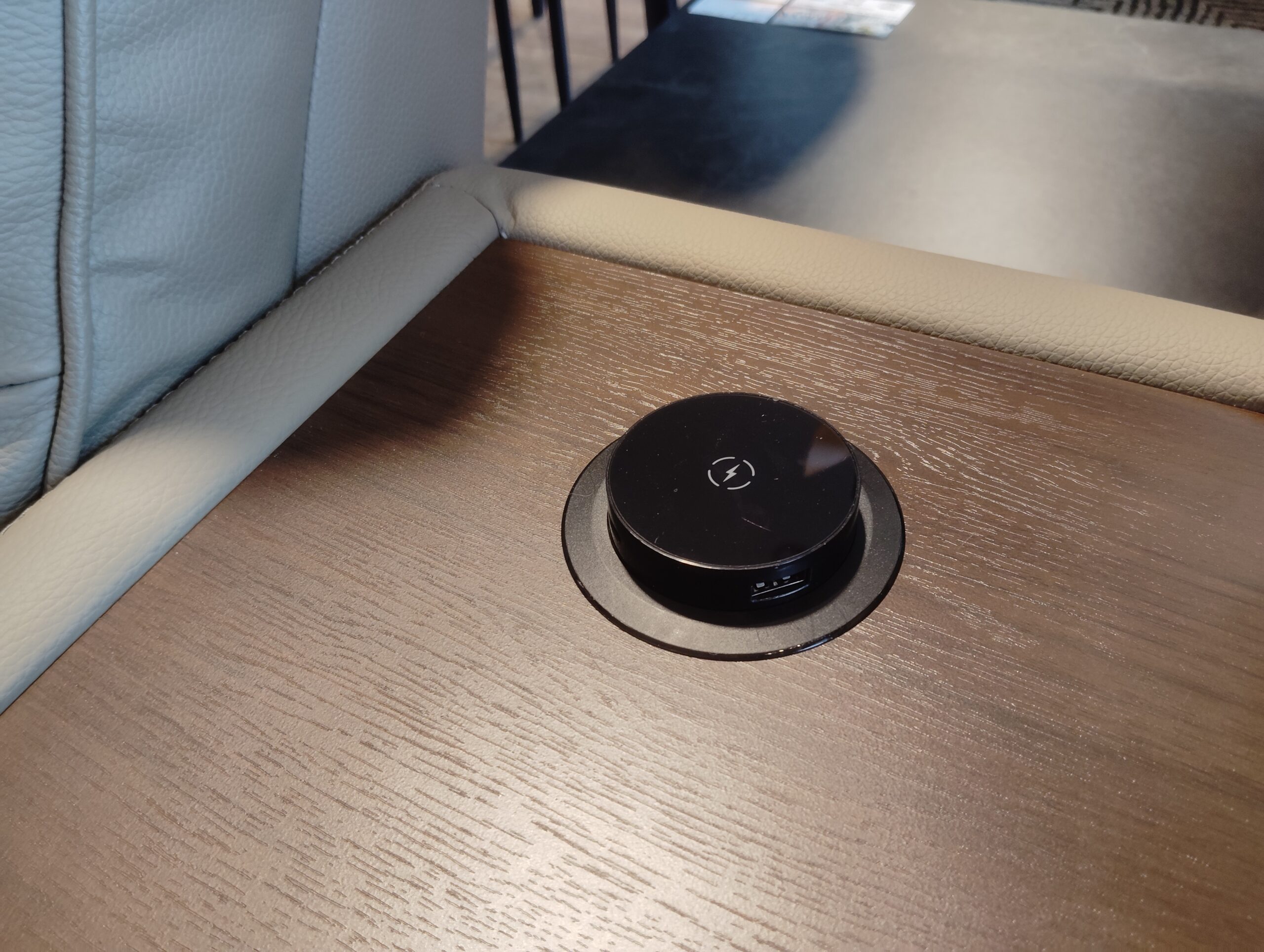 ◎中央テーブルトップには、スマホホルダー、ワイヤレス充電スペース付き。(対応機種あり)