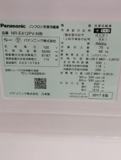 パナソニック/panasonic 2017年製 NR-E412PV 5ドア 冷蔵庫買取しました。