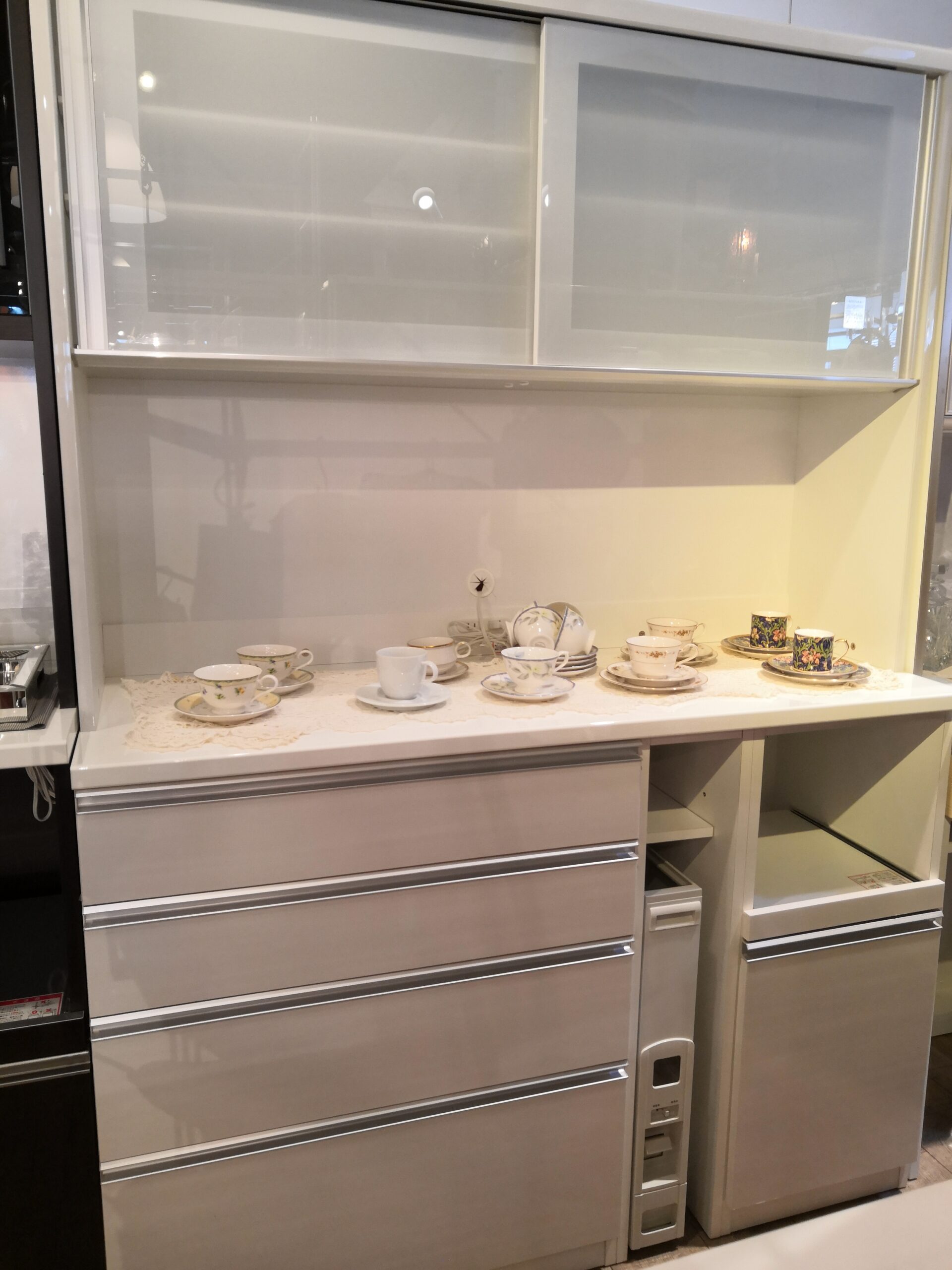 ダストBOX付き 米びつ付き ソフトクロージング 鏡面仕上げ 食器棚 収納棚 レンジボード