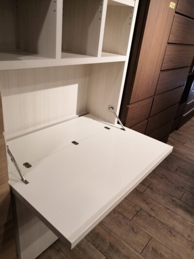 プリンターも置けるライティングデスクが収納されています。