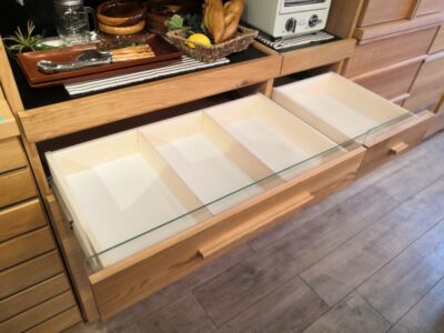 引出しはすべて仕切り付きで、細かなカトラリーやランチョンマット、小物などたくさん収納することができます。