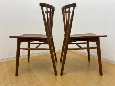 前面から見た時は背もたれの曲木と縦の格子が可愛らしく柔らかな印象が、一方で横から見たときは脚部の角度で、前面から見た時とはまた違った印象を抱くでしょう。