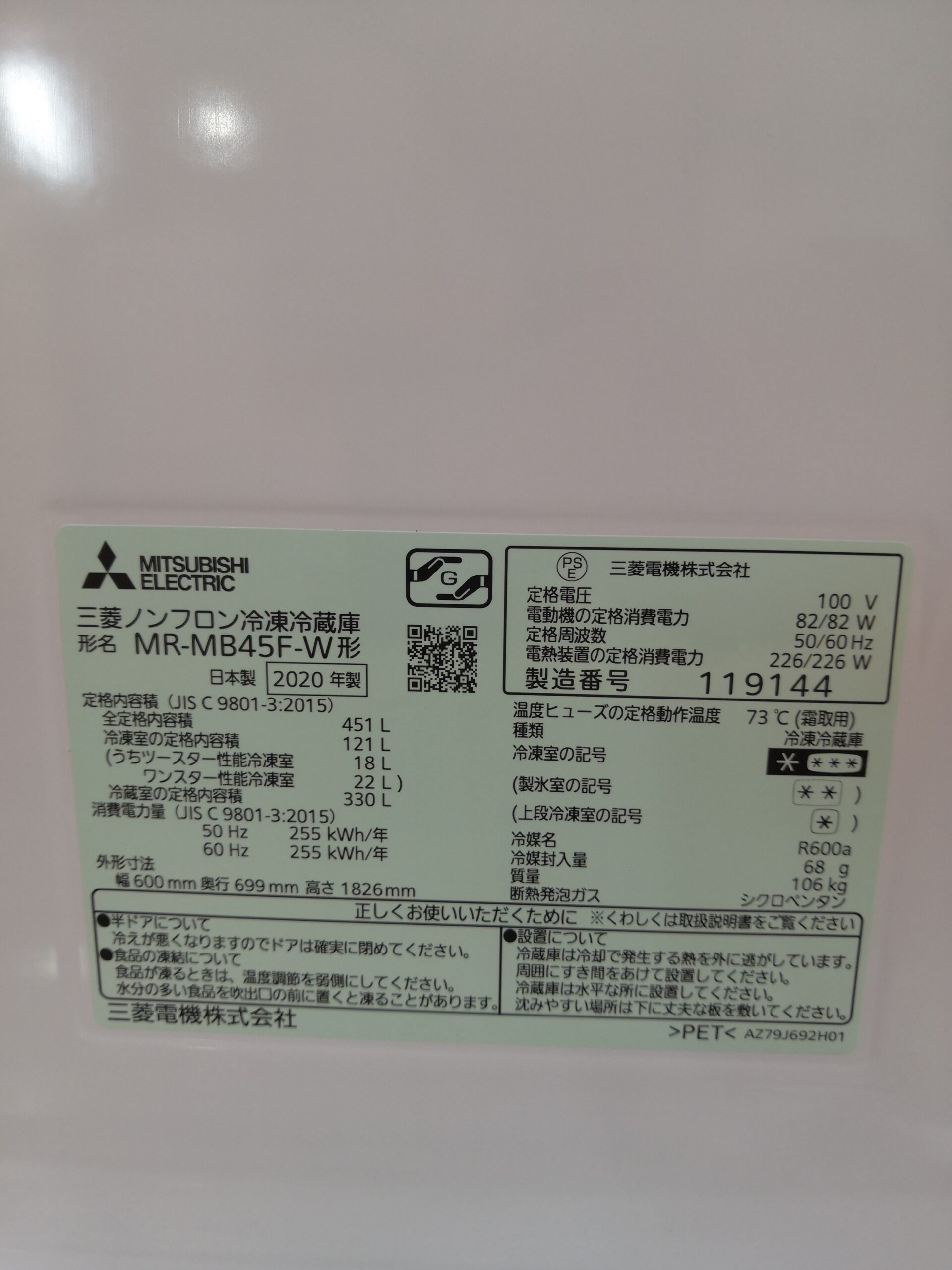 【中古】MITSUBISHI 三菱 スリム 2020年製 MR-MB45F-W 真ん中野菜室 省エネ エコ 置けるスマート大容量 451L 冷凍庫 冷蔵庫 買取しました。