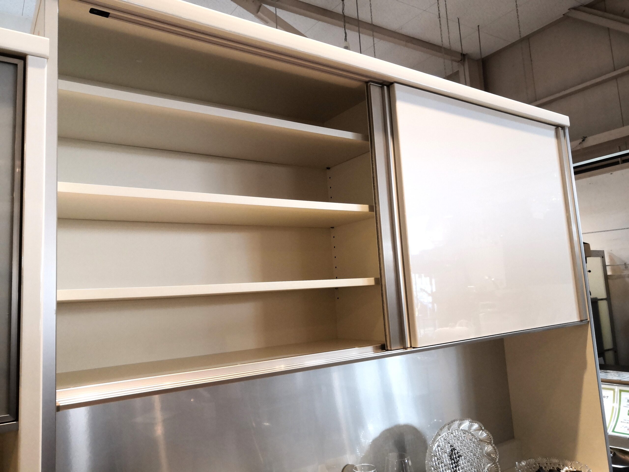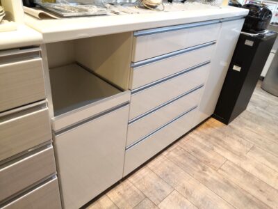 【中古品】Pamouna パモウナ 鏡面仕上げ キッチン家具 白 ステンレス化粧板 幅160センチ レンジボード 買取しました。