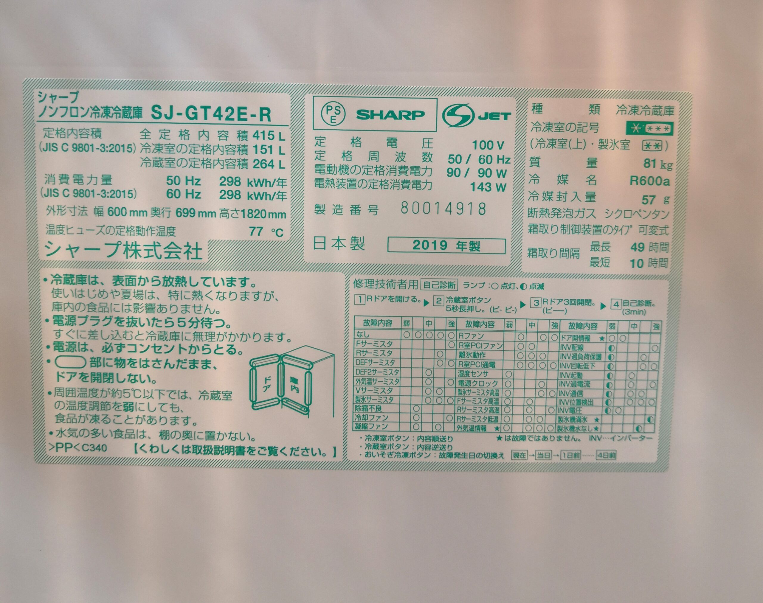 【中古品 】SHARP プラズマクラスター SJ-GT42E-R グラデーションレッド どっちもドア メガフリーザー 4ドア 415L 冷蔵庫 買取しました。