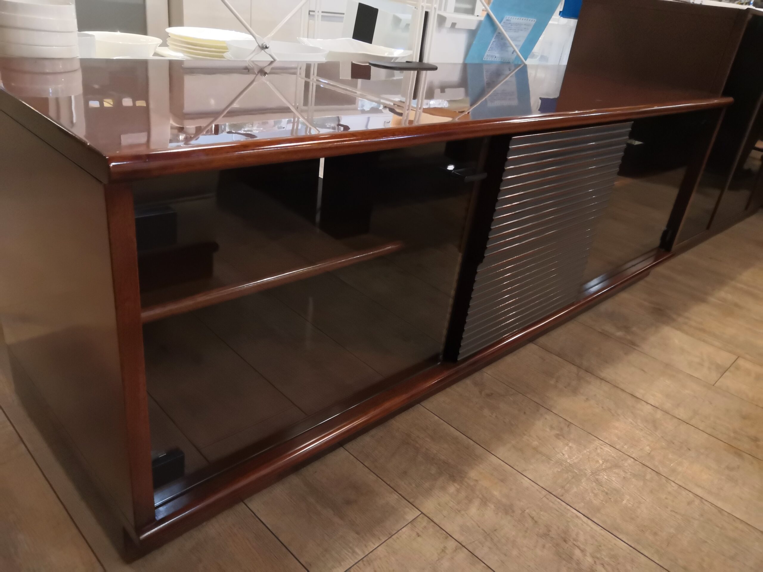 ガラス戸付きのテレビボード。AV機器の収納スペースは広めに設計されています。