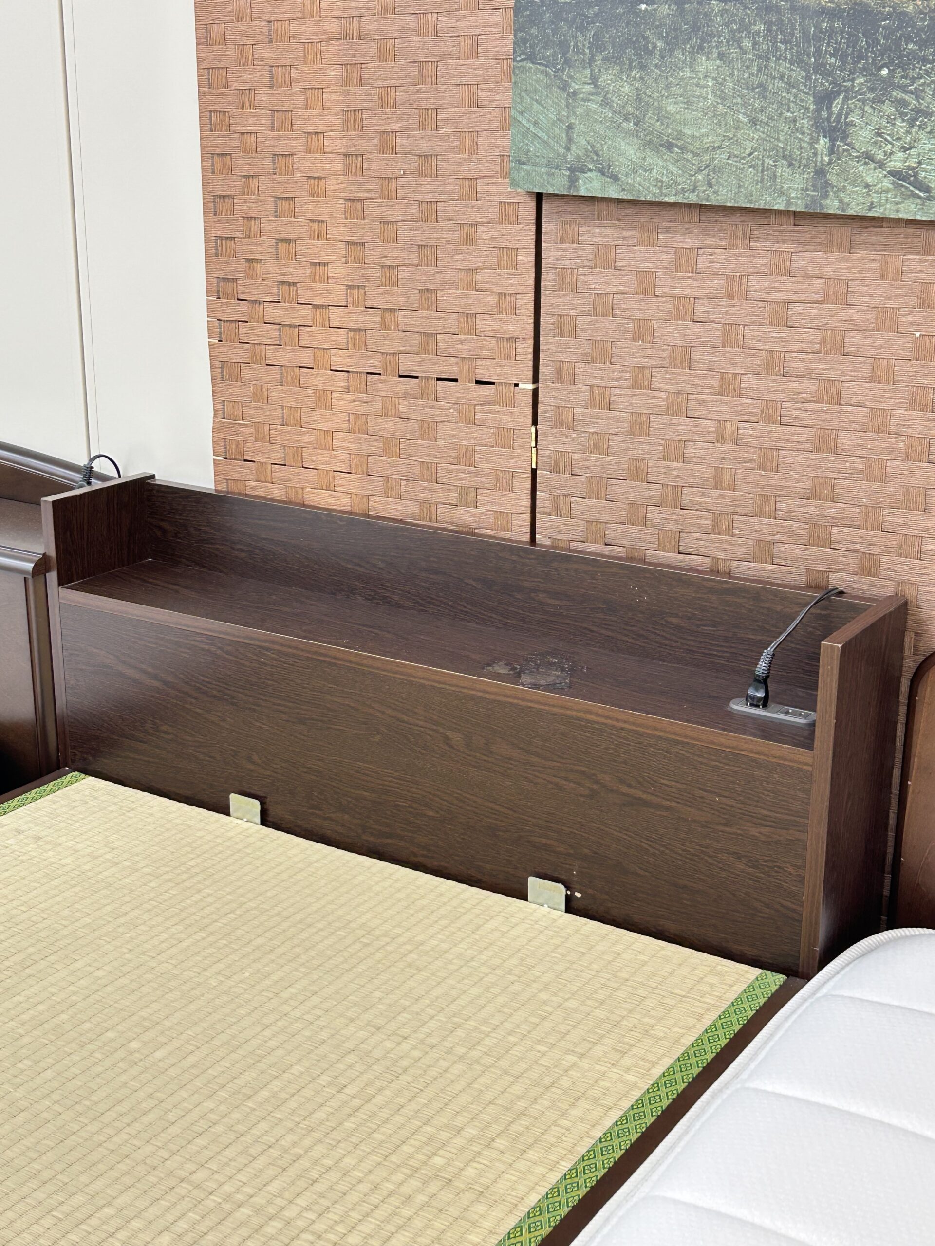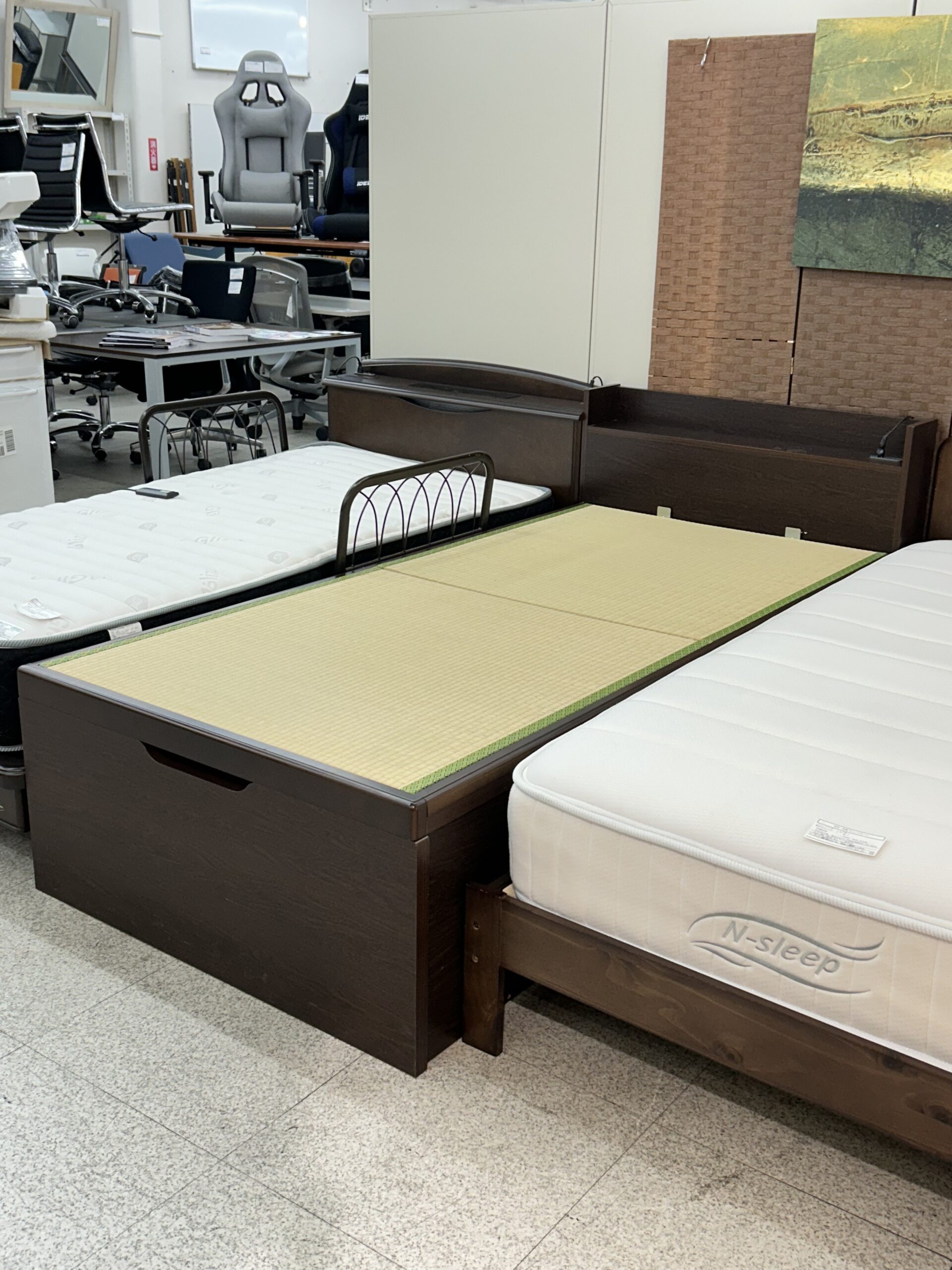 【中古】い草を使用した和モダンな空間に最適なベッド。ガス圧式跳ね上げ収納・棚・コンセント付き◎