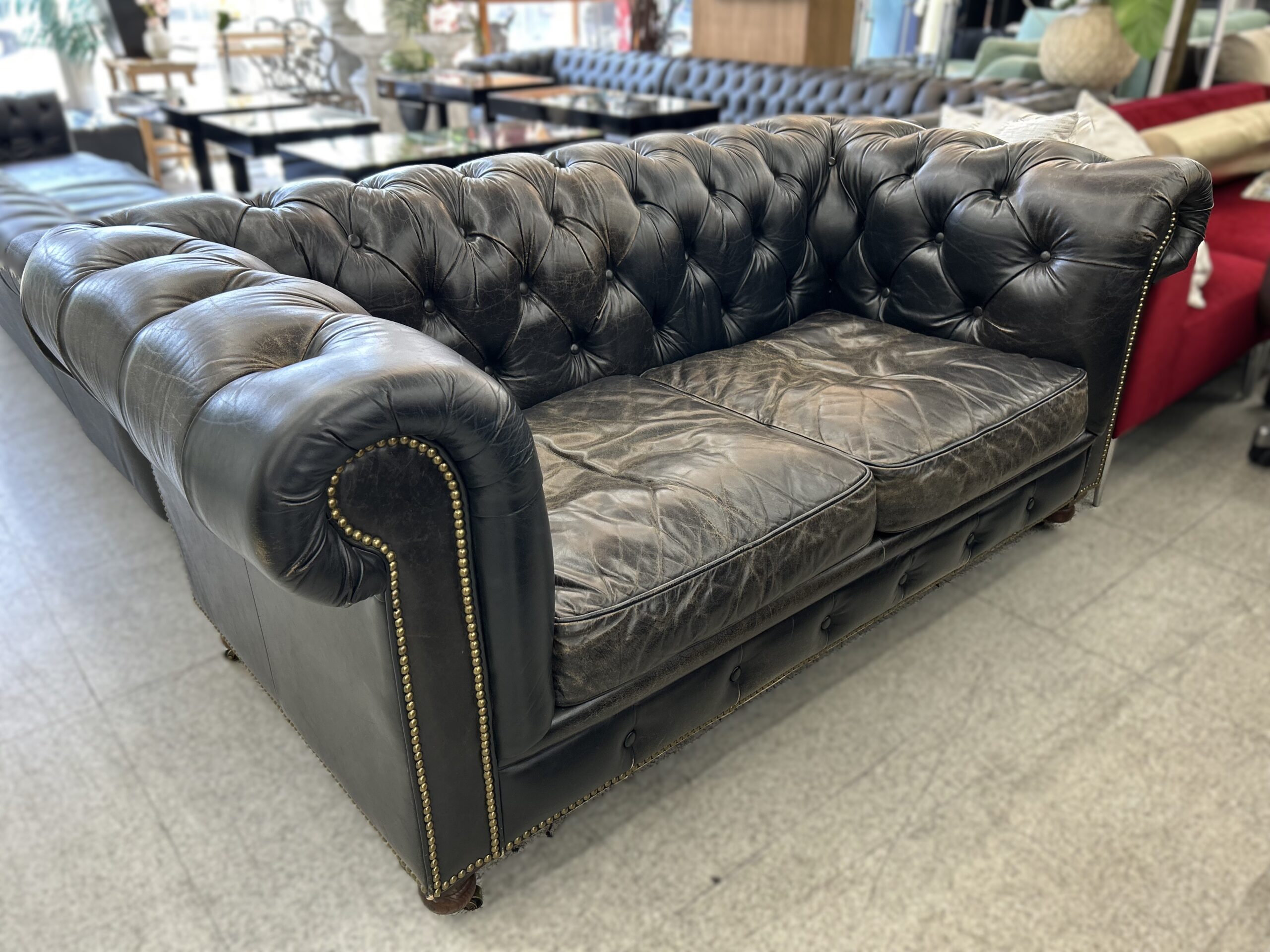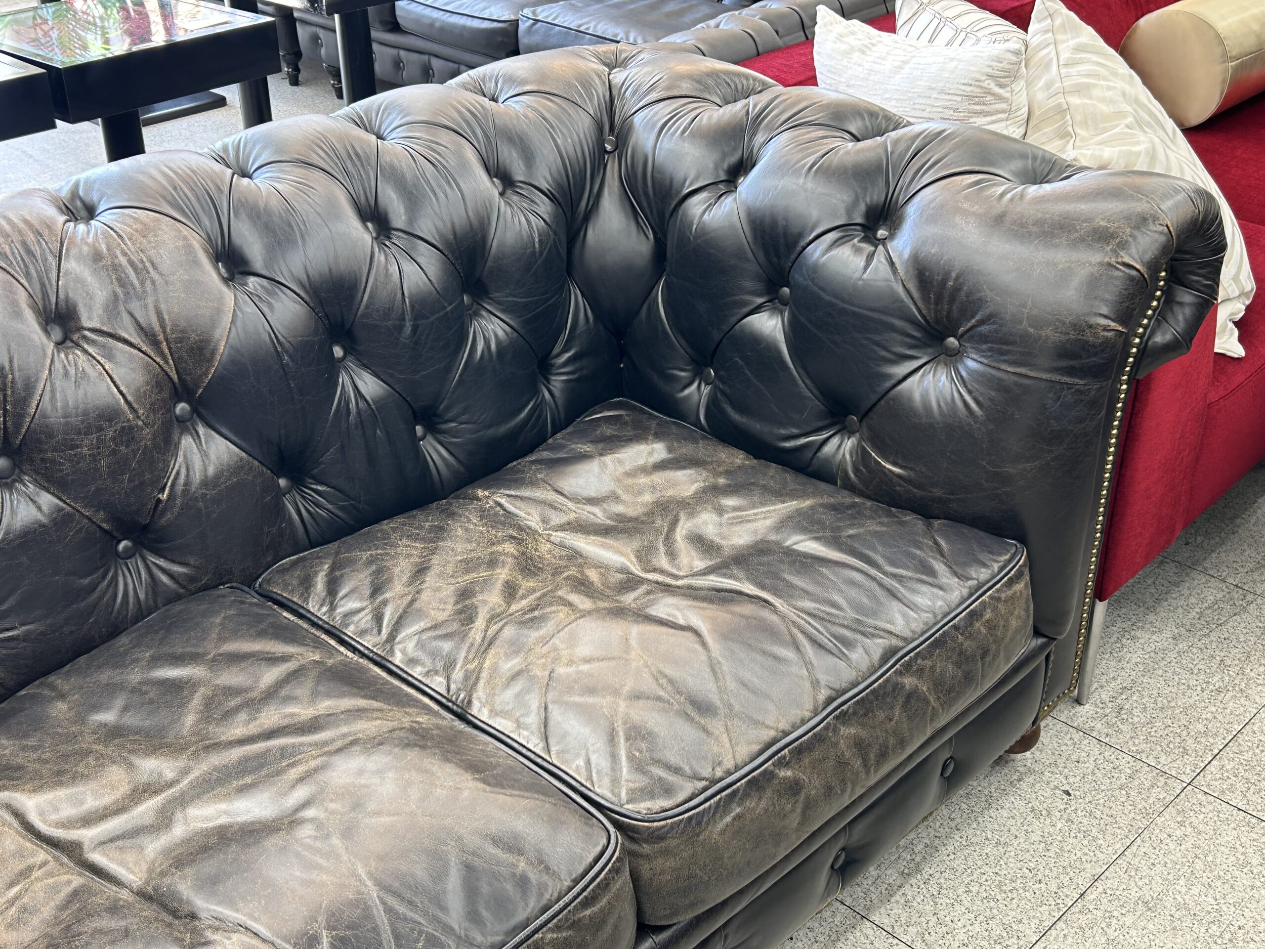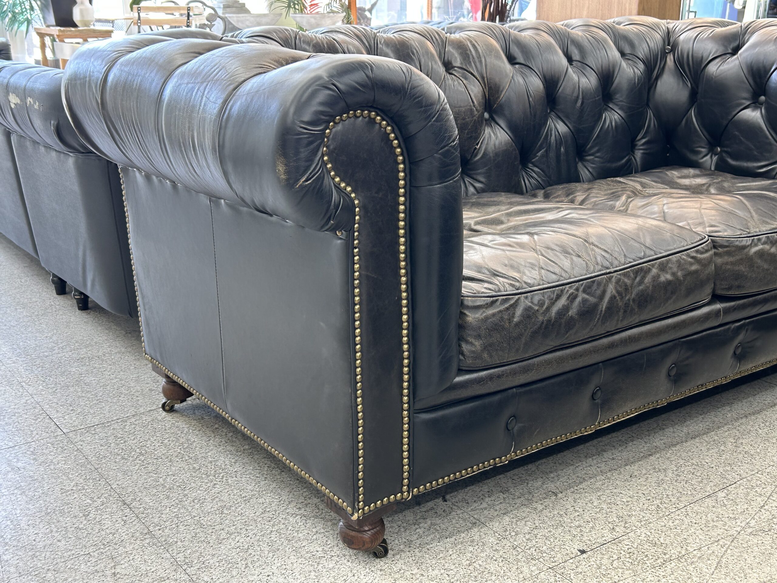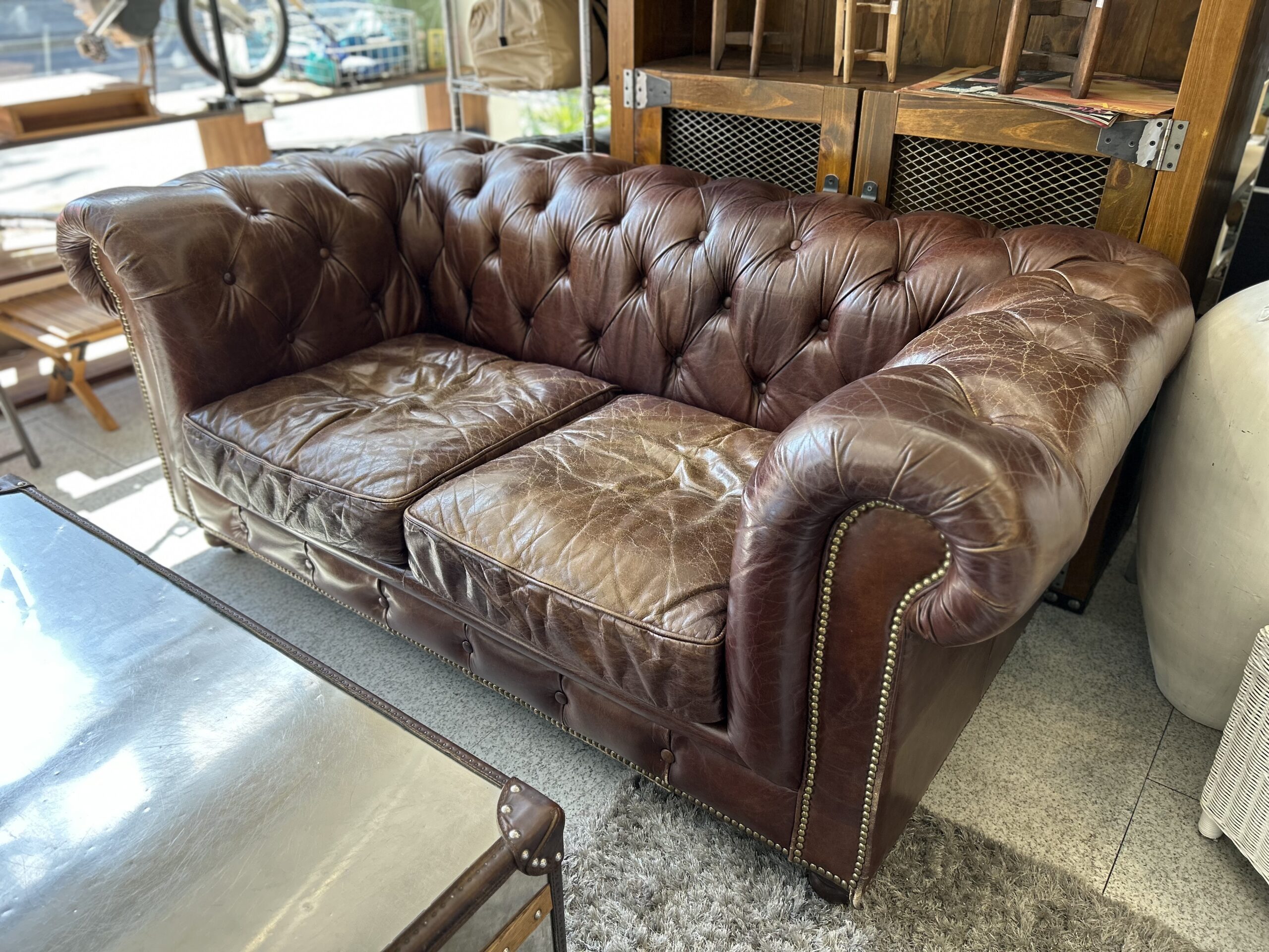 【中古】ヴィンテージ加工の本革製 高級チェスターフィールドソファ。カフェ、バーなど店舗に◎