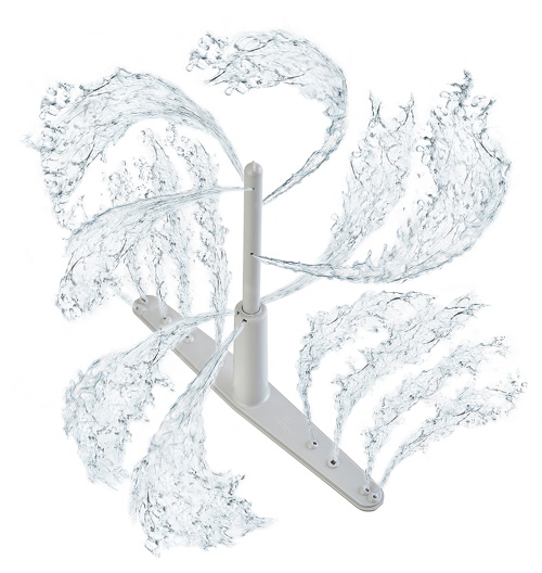 水圧で上下に伸びるセンターのタワーノズルが水平方向に、下部回転式ノズルが垂直方向に高圧シャワーをくまなく噴射。
