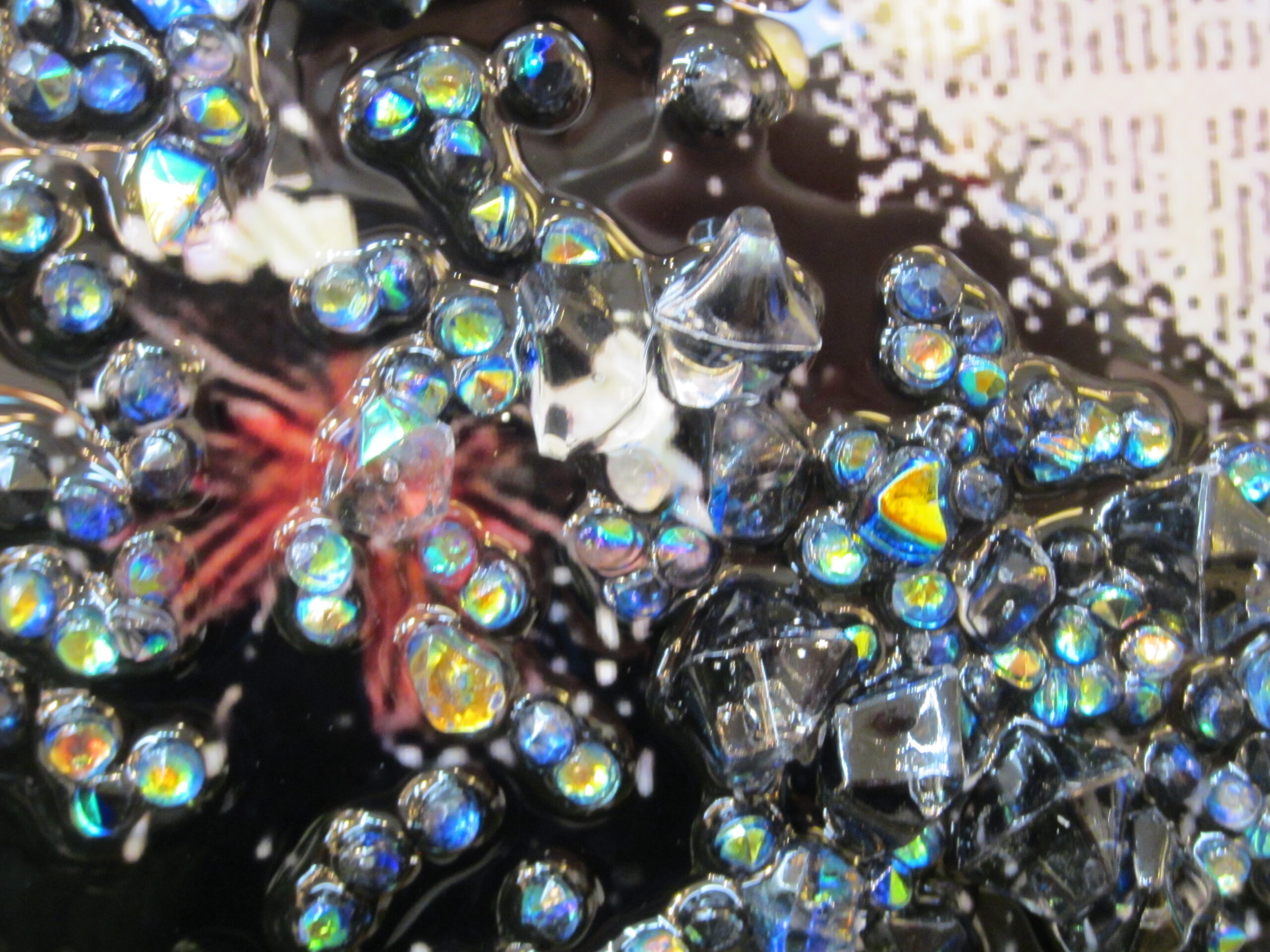 クリスタルアート(水晶絵)とは、プリントアウトしたものに樹脂を流し込み、光沢を出し、そこにクリスタルやラインストーン、ラメなどで装飾したアートパネルです。