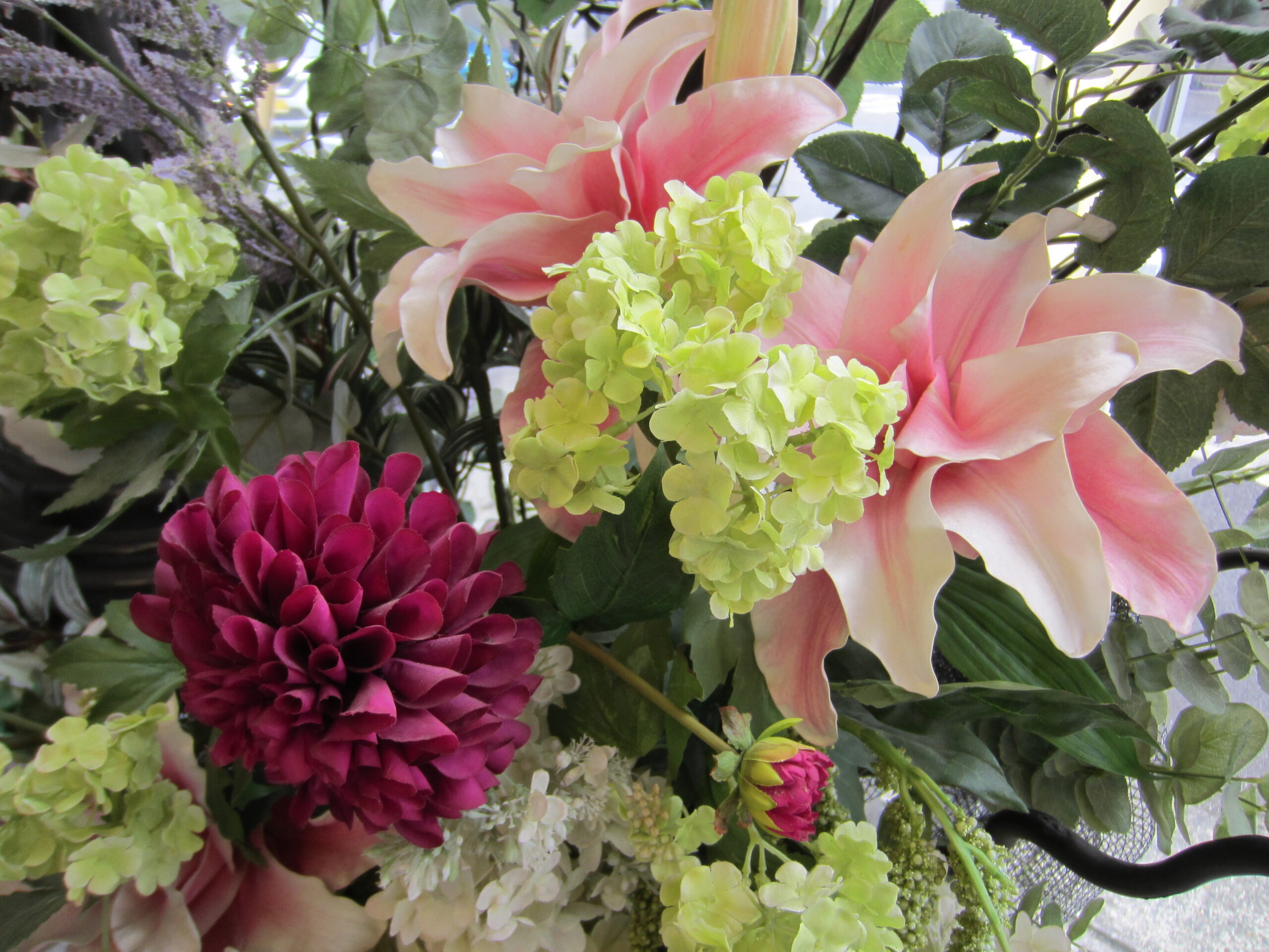 カサブランカ、アジサイ、ダリア、バラを中心としたゴージャスなアートフラワーと花瓶のセットです。