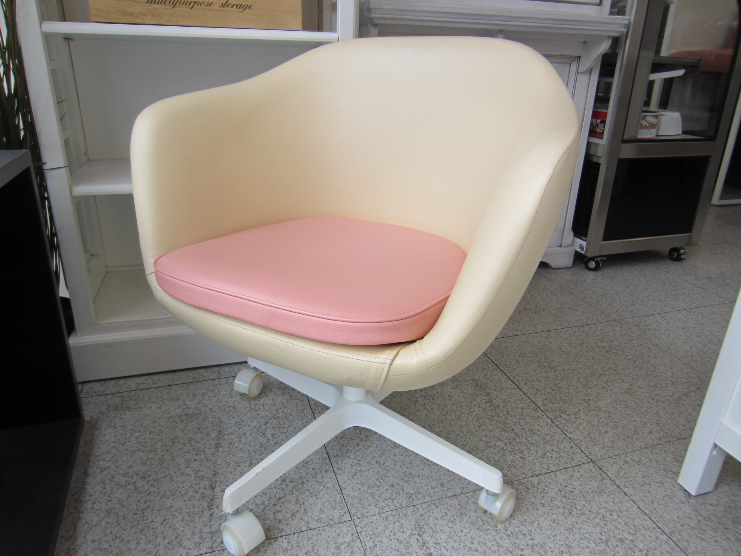 クリーム色×ピンクのカラーとコロンとしたフォルムがかわいらしい印象のアームチェア。