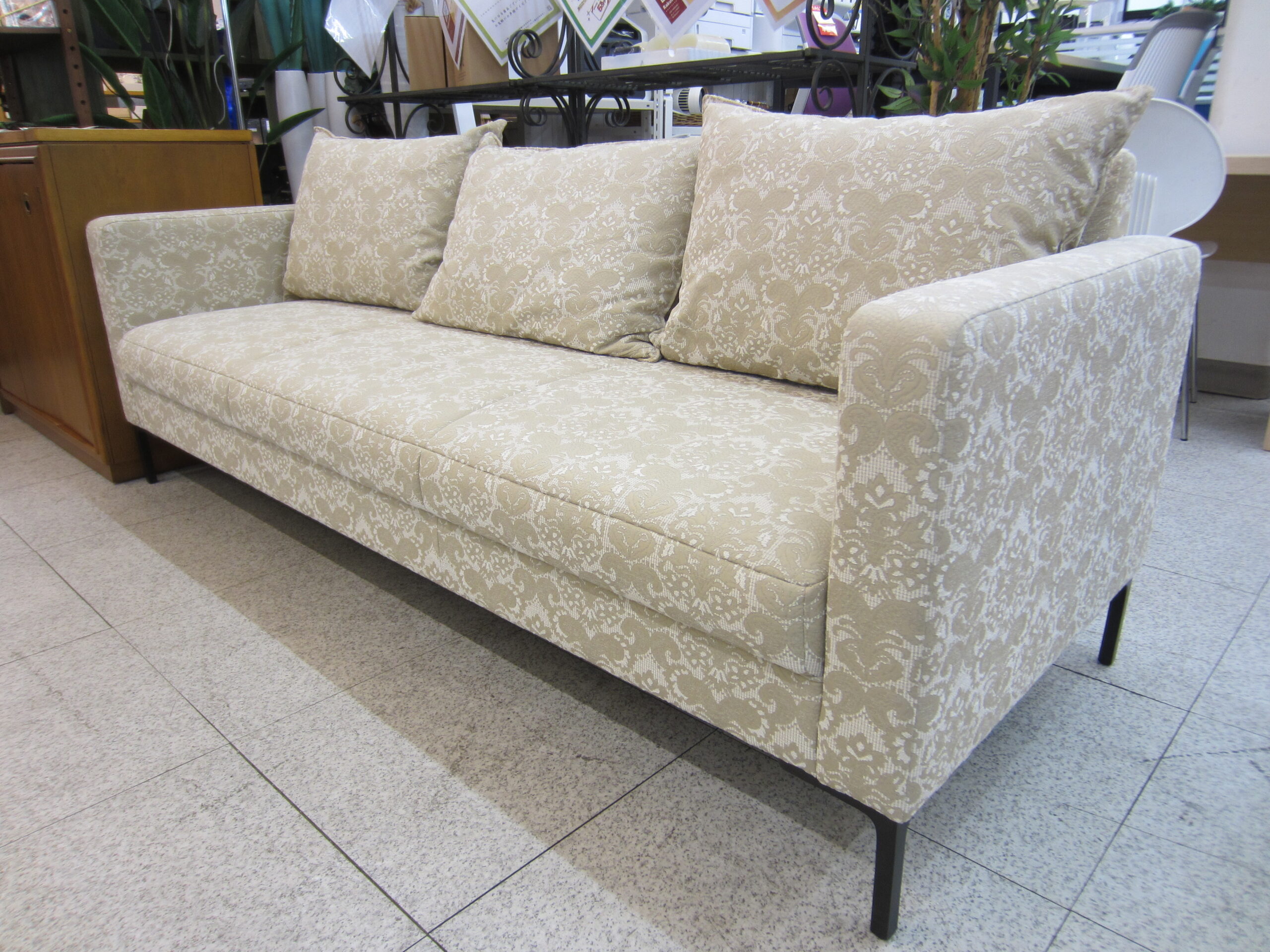 柄物の張地ではありますが、シンプルな脚・造形のソファですので、上品ですっきりとした印象です。