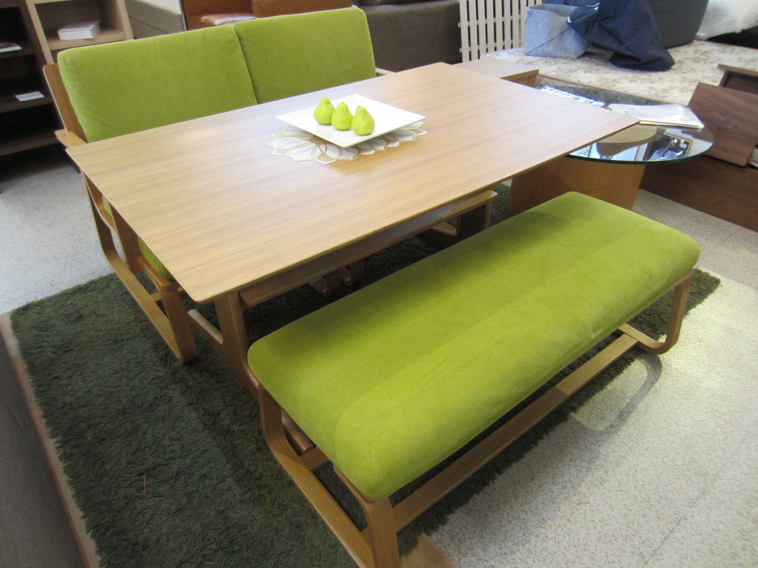 さわやかなグリーンの座面が印象的な、ベンチダイニング4点セットです。