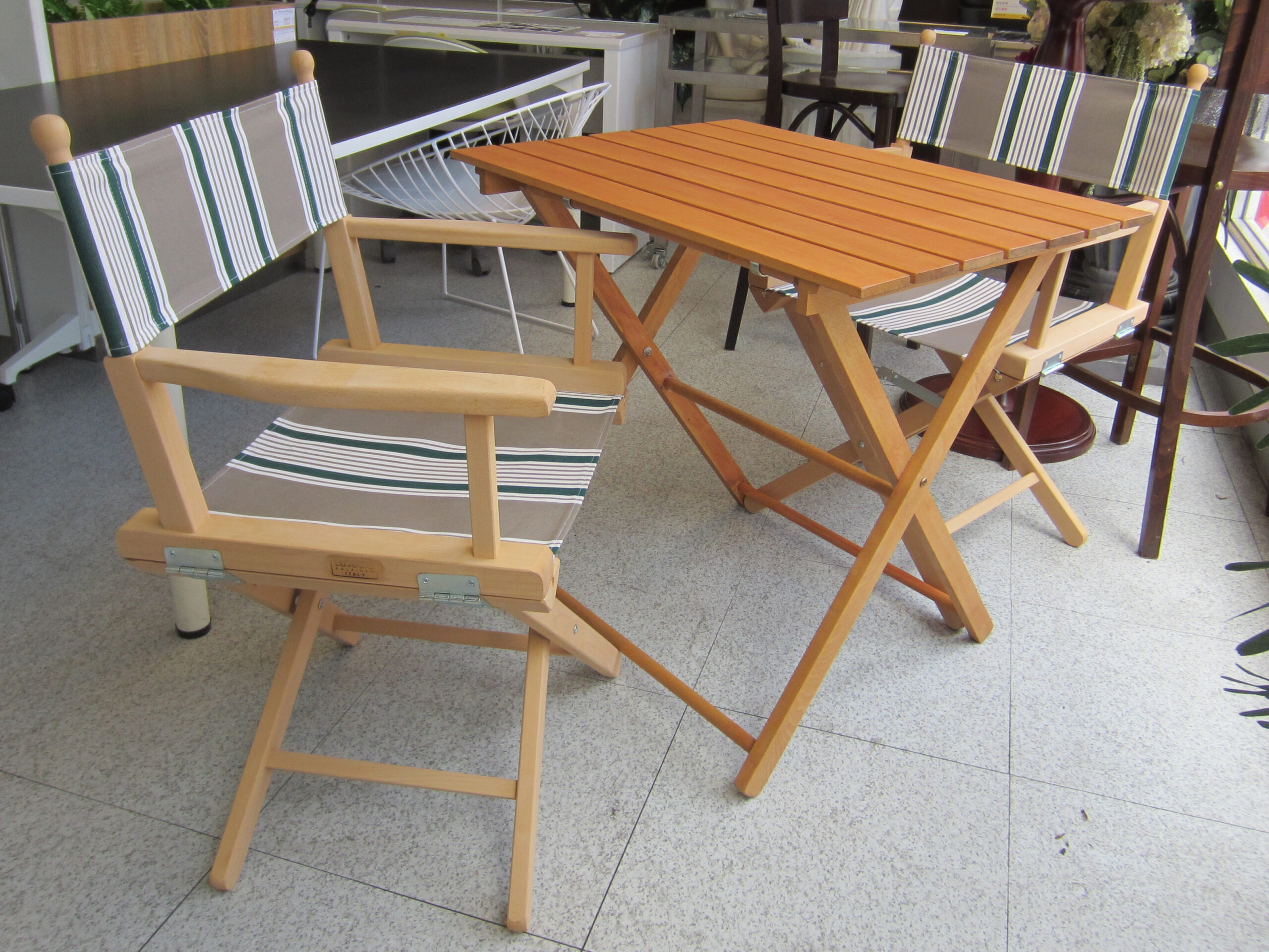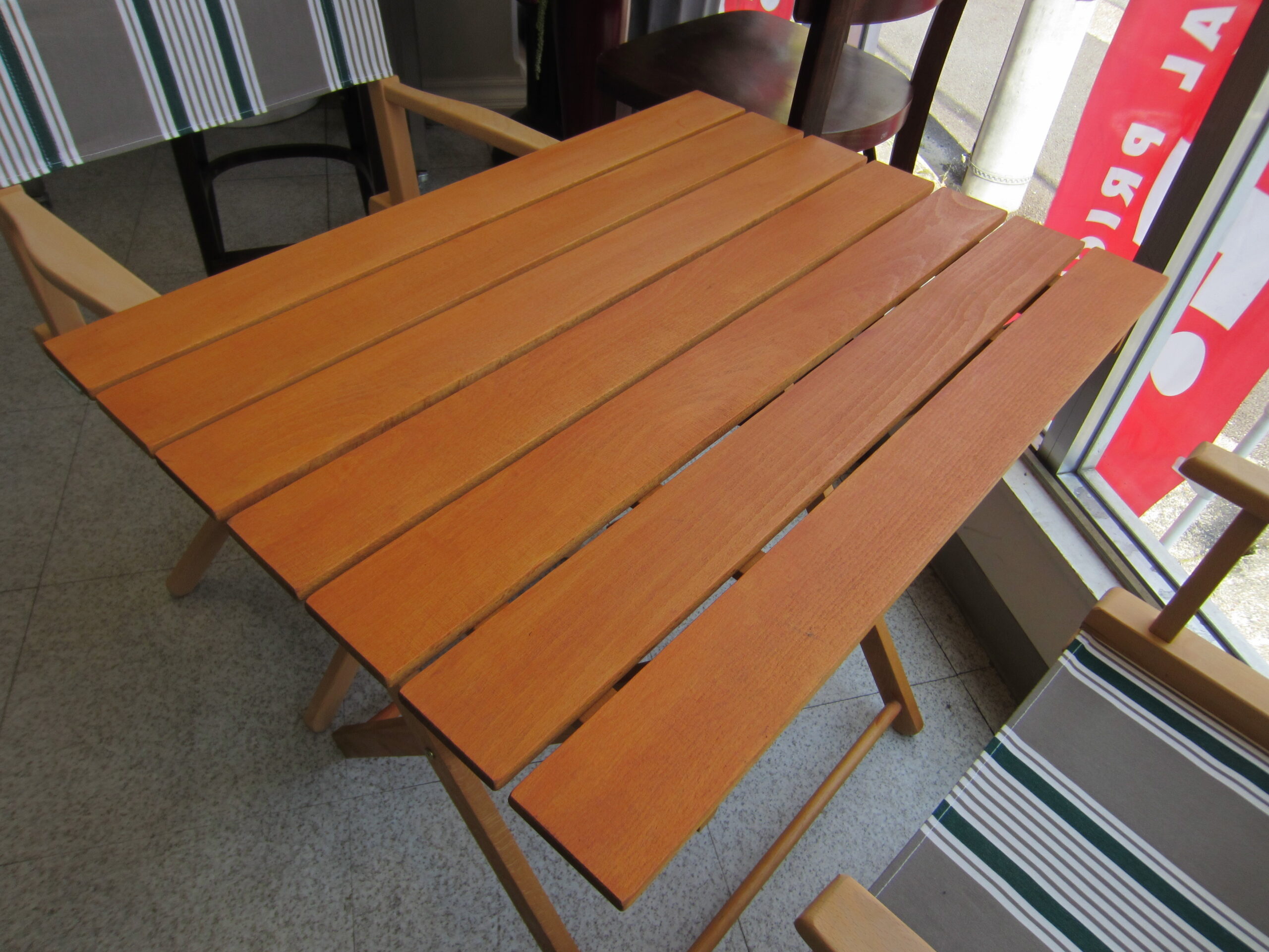 客船のデッキチェアなどで培われた折りたたみ家具のノウハウを追求して創られたイタリア製、無垢ビーチ材の屋外用テーブルとチェアです。