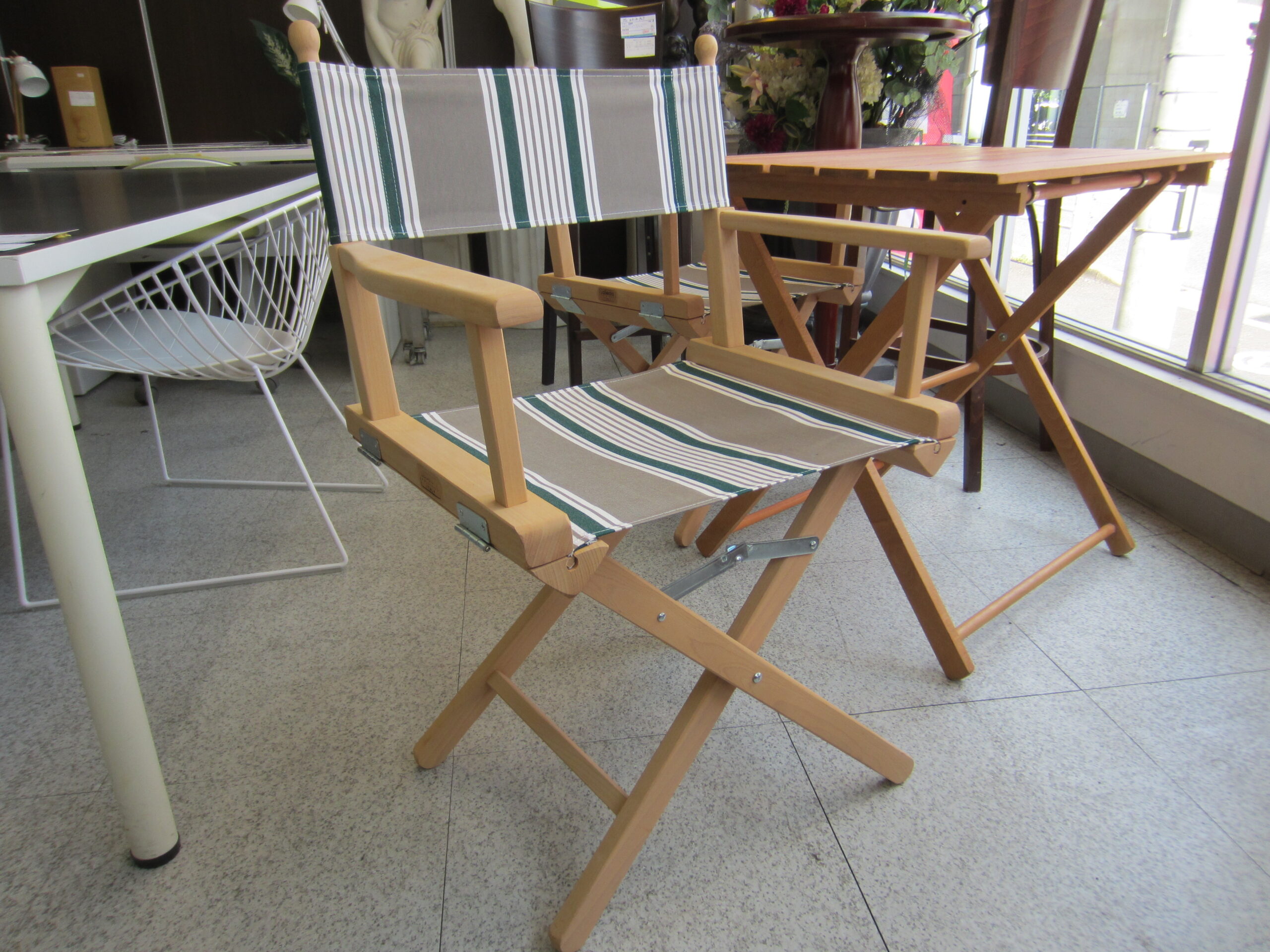 ラ・セディア社製、無垢ビーチ材の屋外用テーブルとチェア。テラスやお庭、グランピングに◎