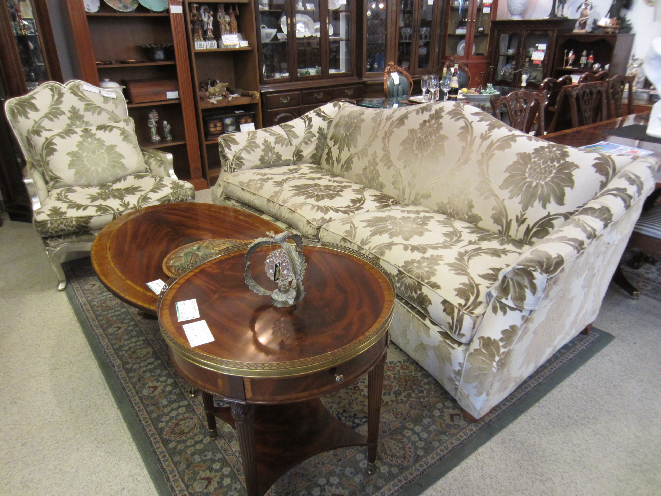 クラシックなフォルムと大き目の柄・シックな色合いでありながら、華やかな雰囲気の印象です。