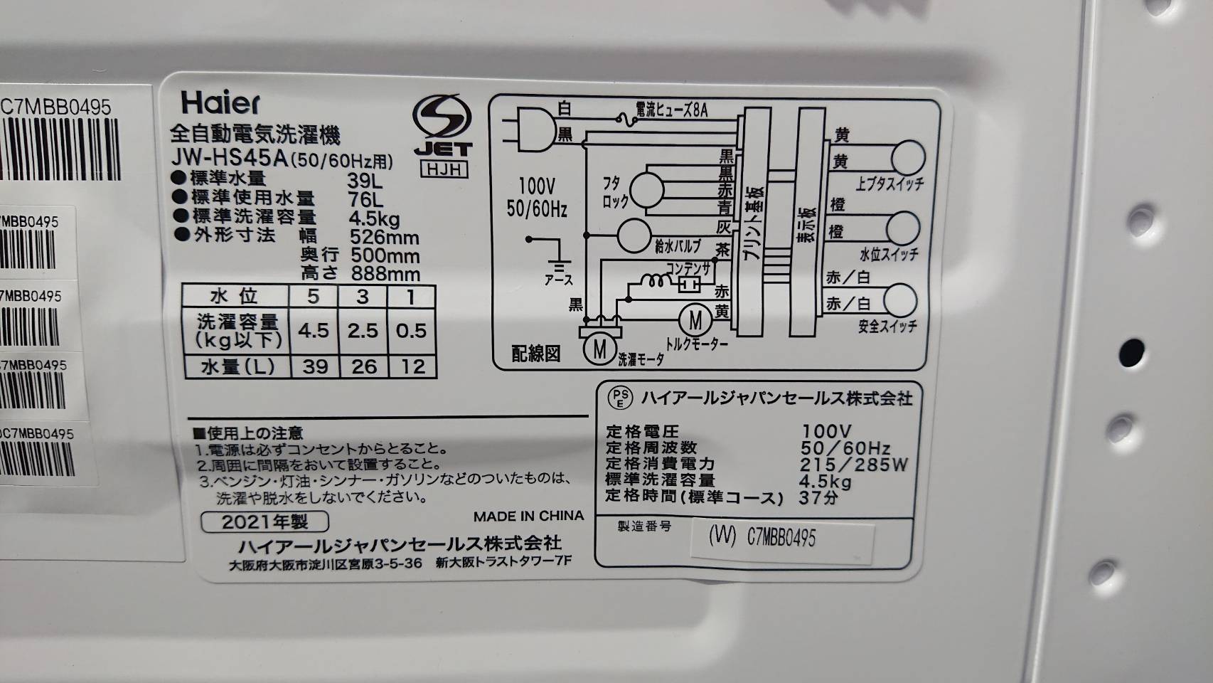 2023.09.29中古 ハイアール 4.5kg全自動洗濯機 JW-HS45A 2021年製 買取しました!
